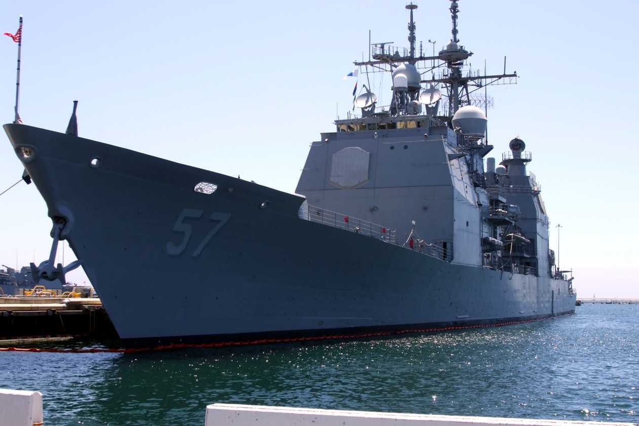 Description: A large ship docked in a harbor with a dock in the background and a flag flying in the air.