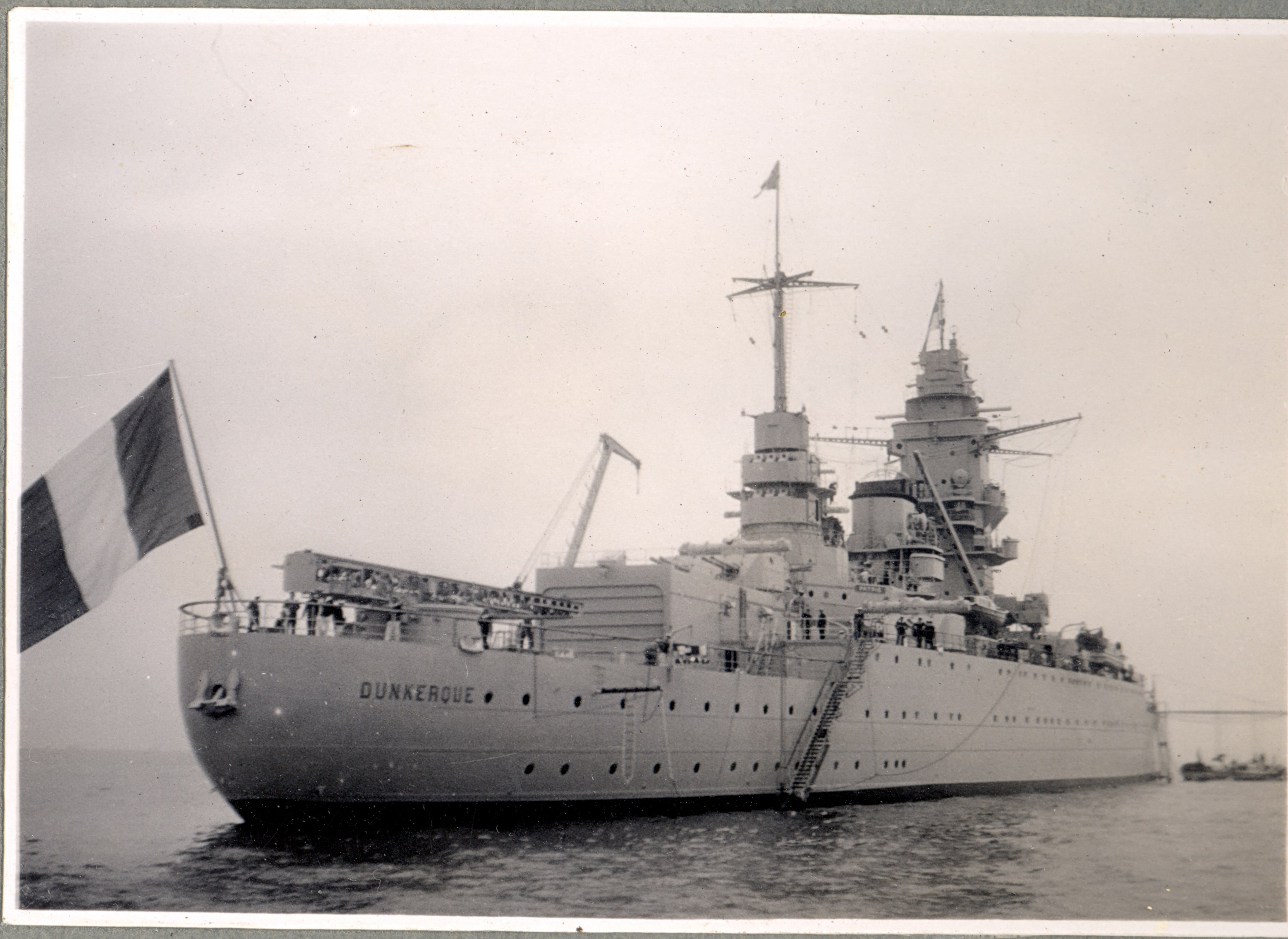 Description: A large ship with a flag on the front of it in the water with a flag flying from the mast.