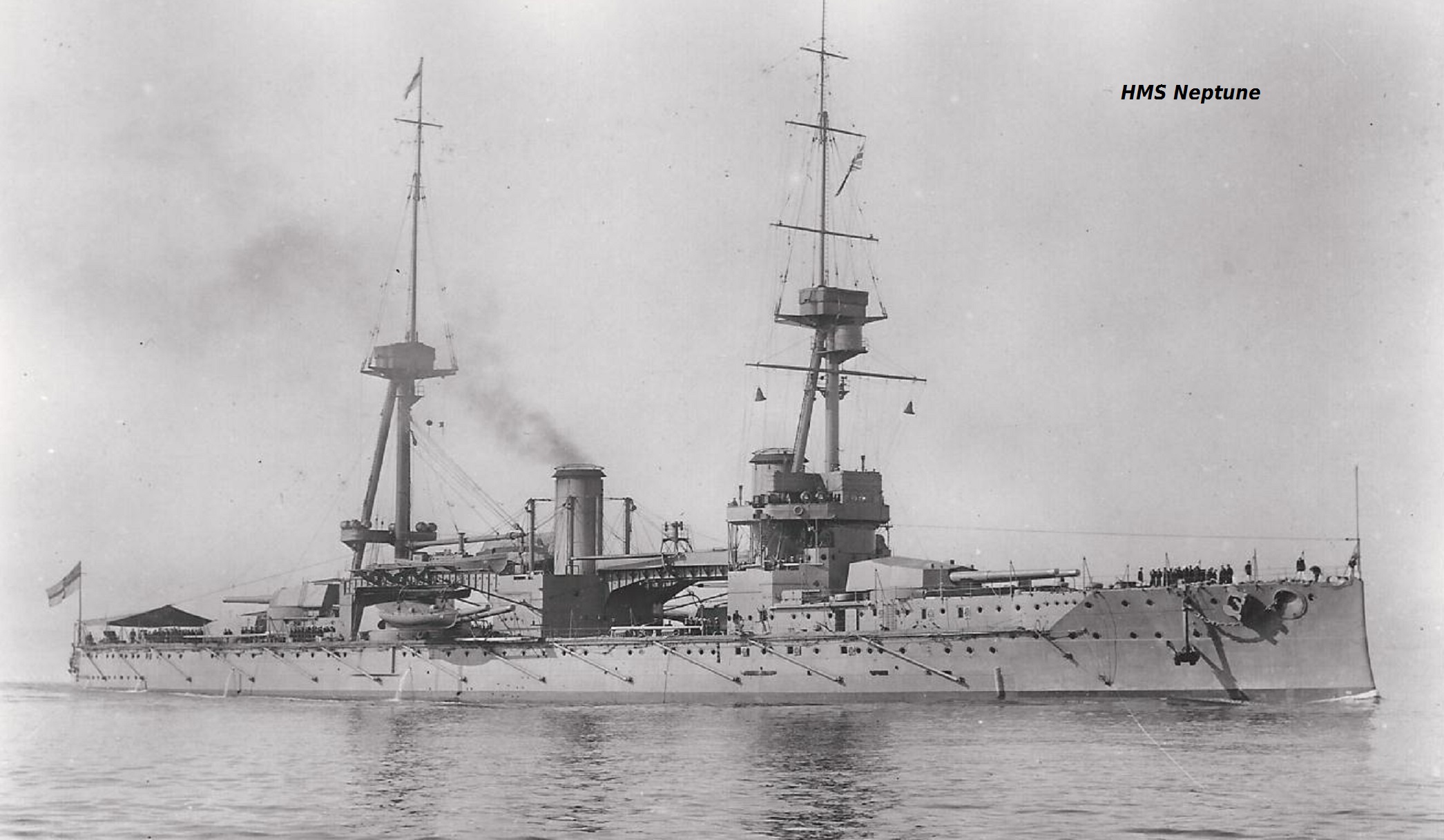 Description: A large ship floating on top of a body of water next to a boat with a flag on it.