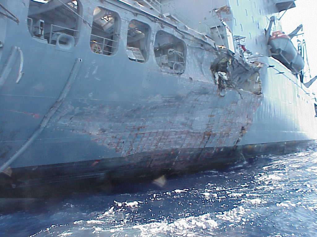 Description: A large ship in the water with a man standing on the side of it looking out at the water.