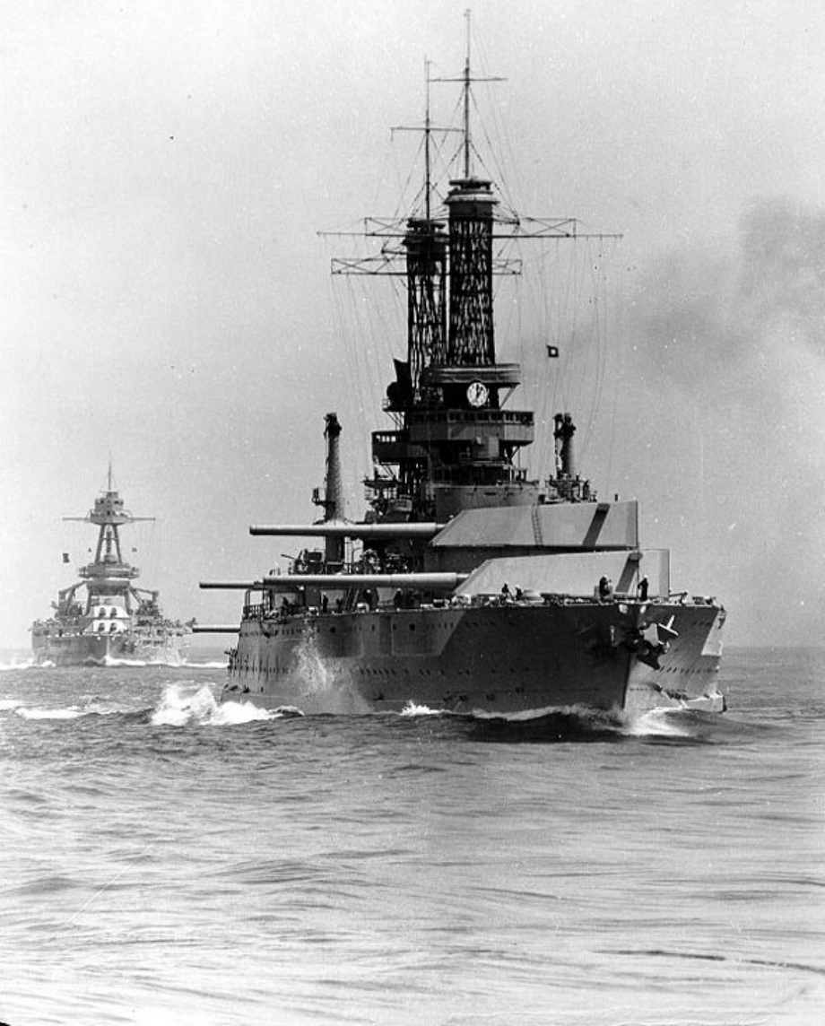 Description: A large ship in the water with another ship in the background in the ocean with smoke coming out of it.