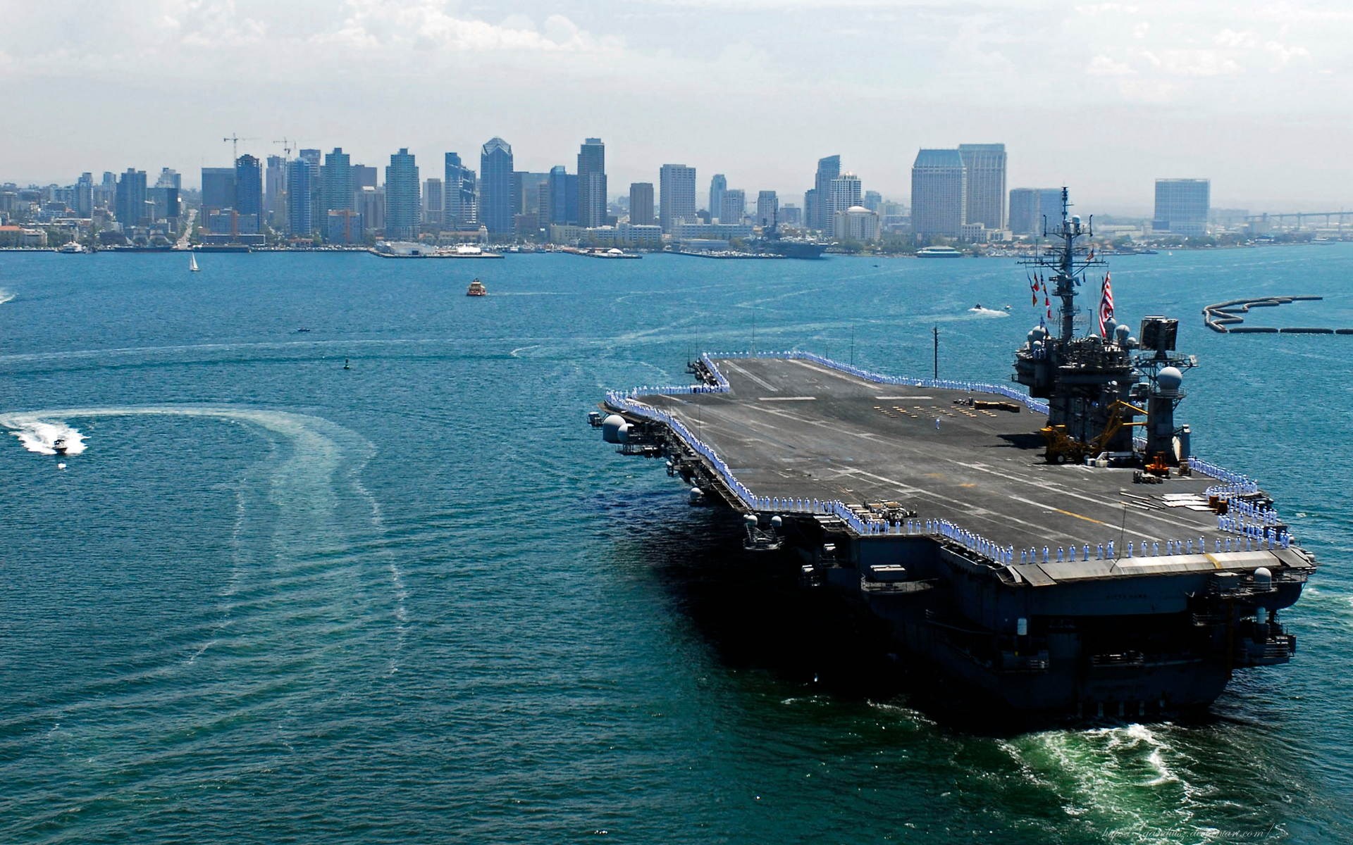 Description: A large ship in the middle of the ocean with a city in the background in the water with a boat in the foreground.