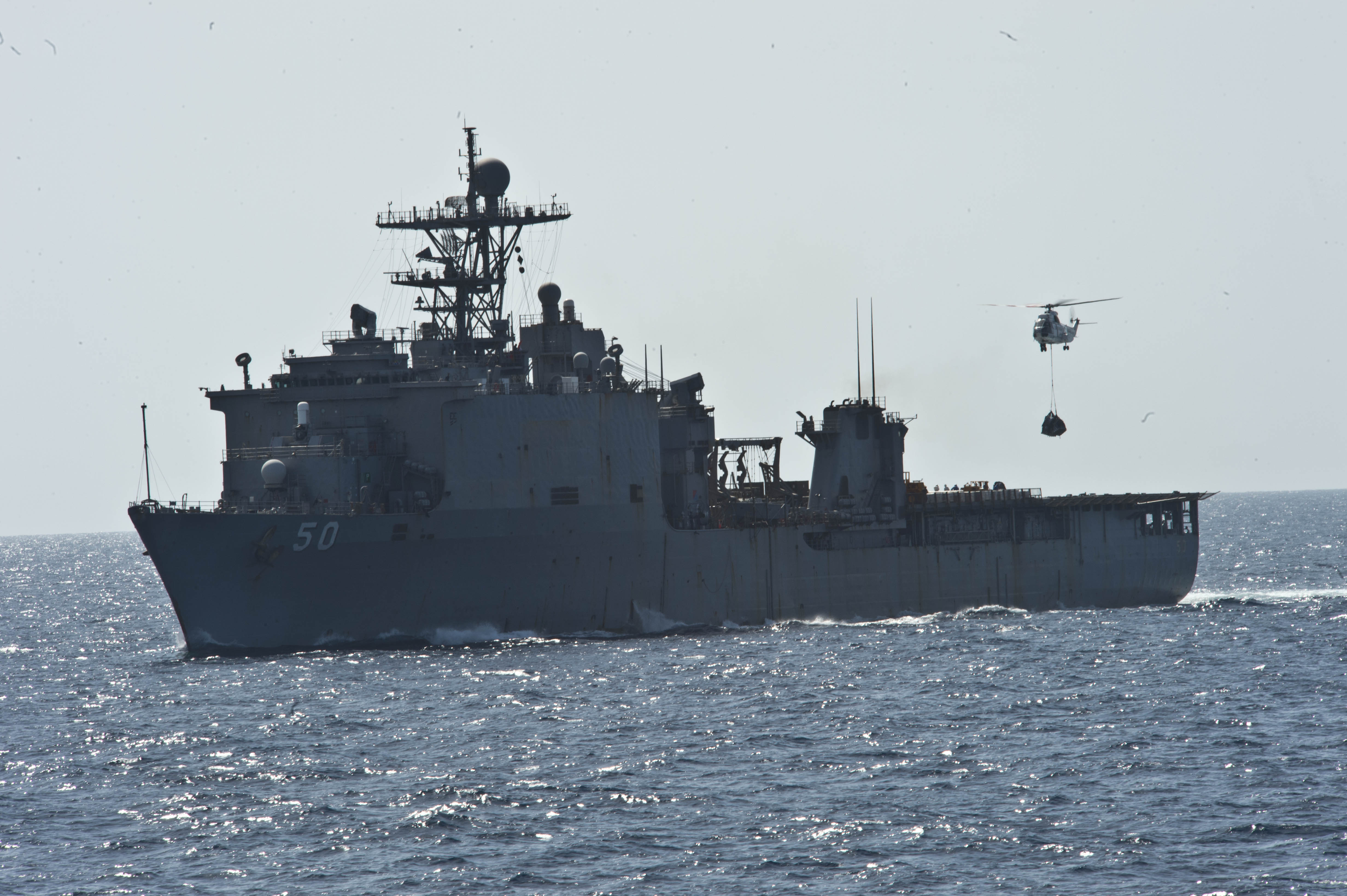 Description: A large ship in the middle of the ocean with a helicopter flying over it and a helicopter landing on the ship.