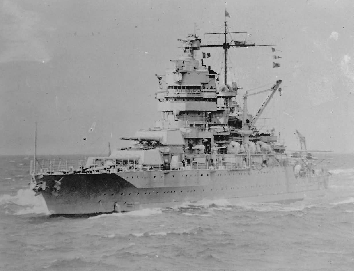 Description: A large ship in the middle of the ocean with a lot of people on it's side and a flag on the top of the ship.
