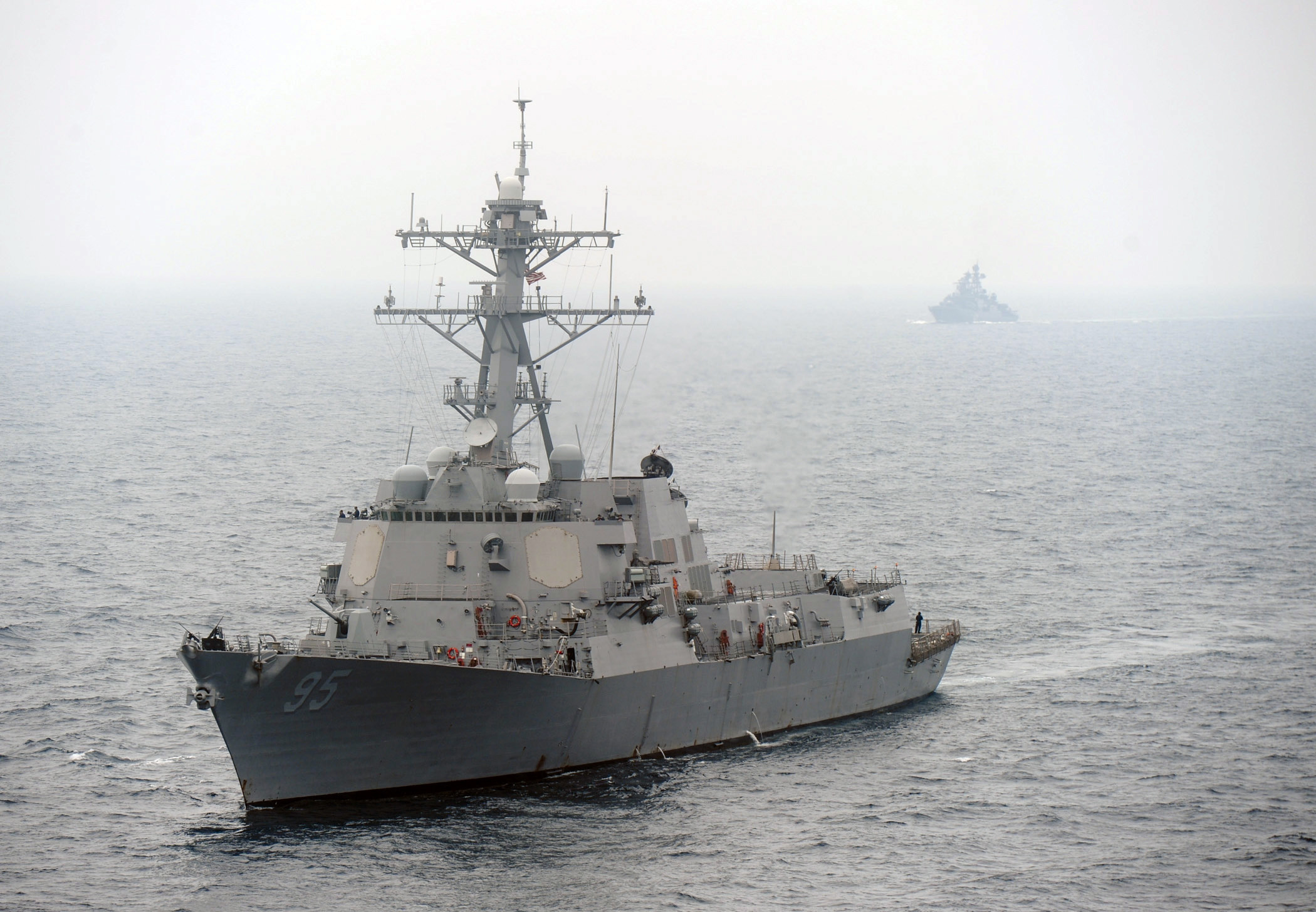 Description: A large ship in the middle of the ocean with a smaller boat in the background in the distance.