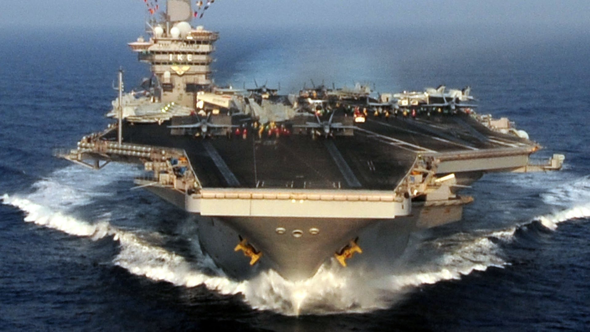 Description: A large ship in the middle of the ocean with a lot of people on it's deck and a lot of smoke coming out of it.