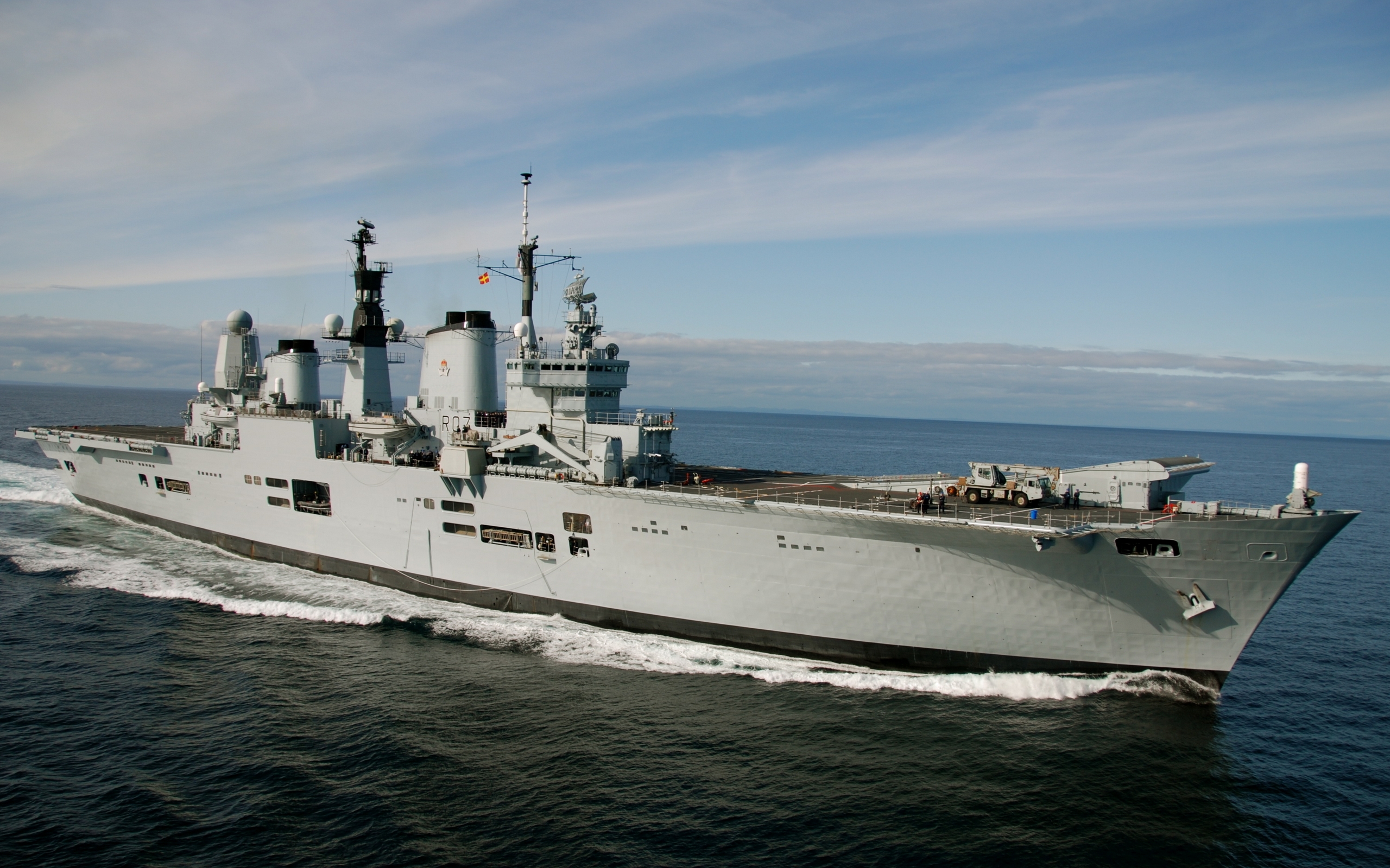 Description: A large ship sailing across the ocean on a sunny day with a blue sky above it and a few clouds in the sky.