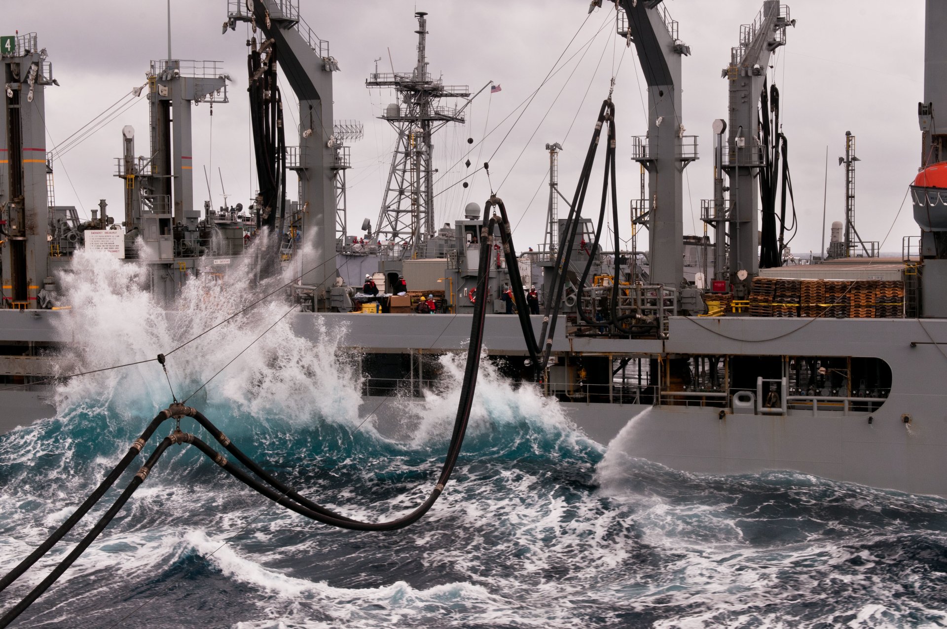 Description: A large ship in the ocean with a lot of water around it and a bunch of large ships in the background.