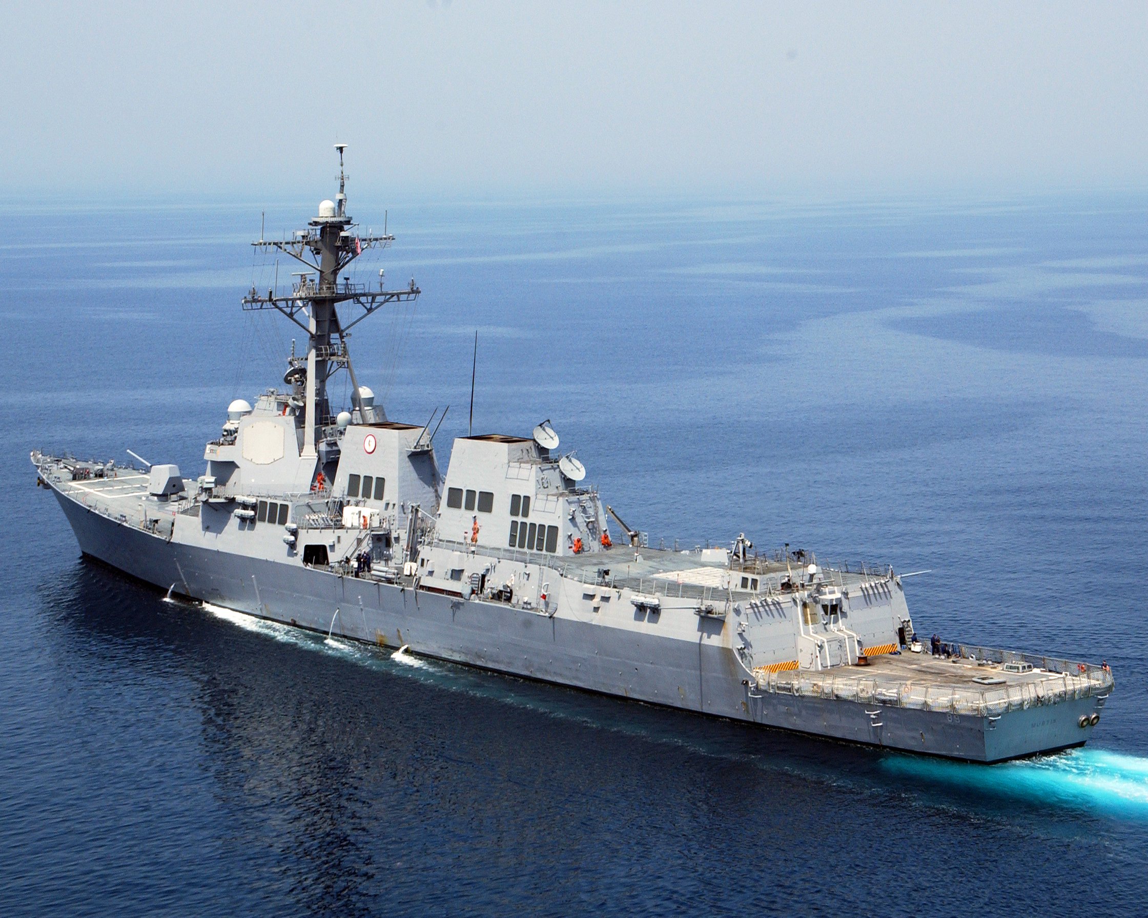 Description: A large ship in the middle of the ocean with a lot of water around it and a few people on the deck.