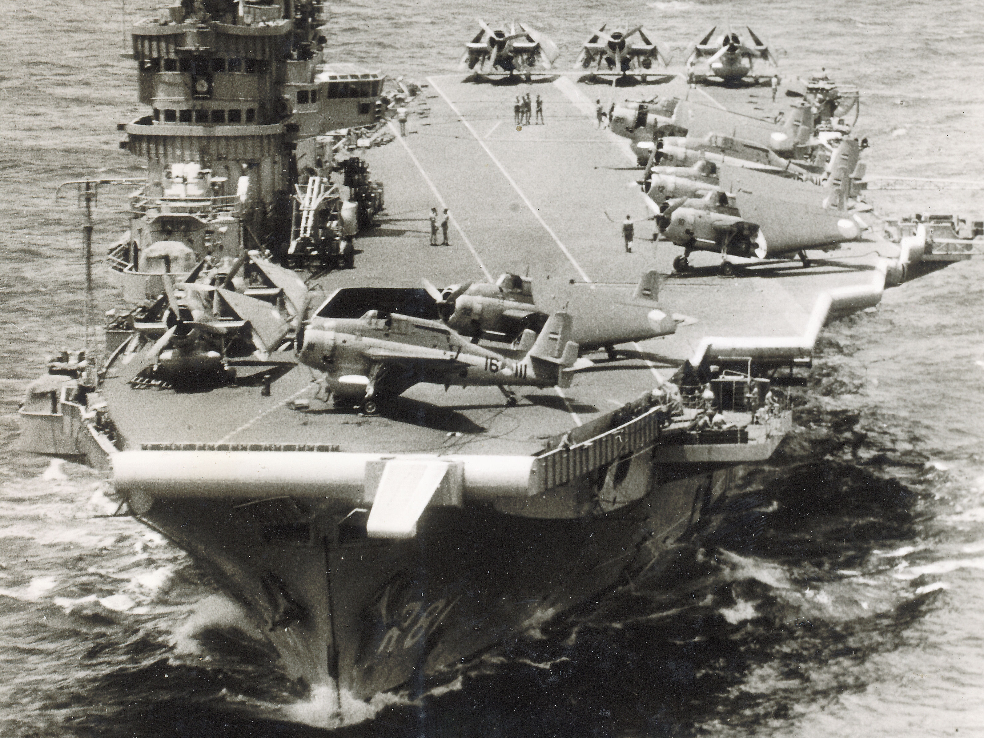 Description: A large ship with a bunch of planes on it's back end in the water with other ships in the background.