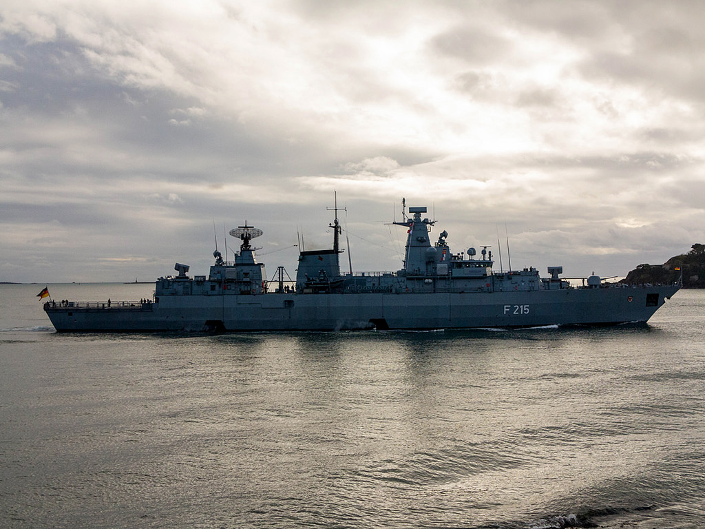 Description: A large ship sailing across a body of water under a cloudy sky with a yellow flag on it's side.