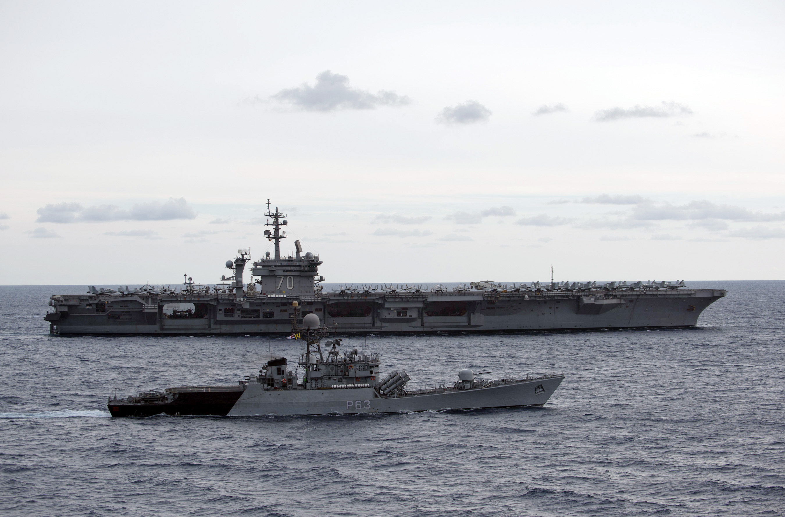 Description: A large ship and a smaller boat in the water near each other in the ocean with a larger ship in the background.