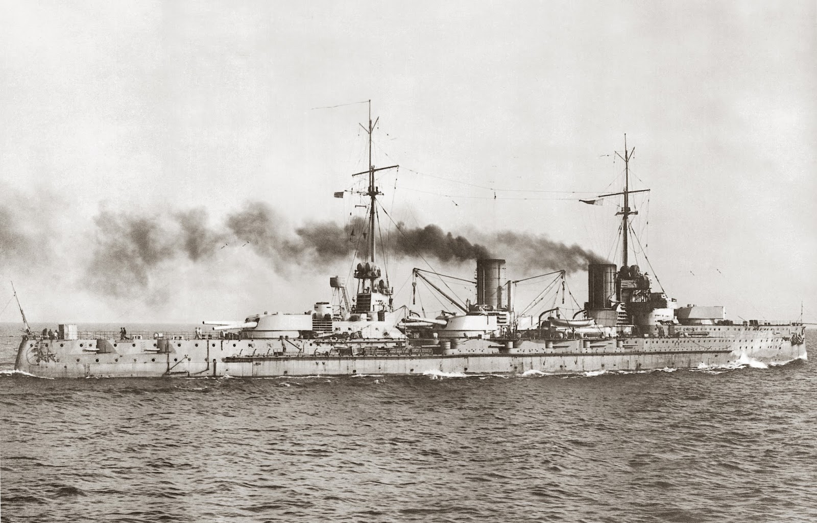 Description: A large ship with smoke coming out of it's stacks in the water.