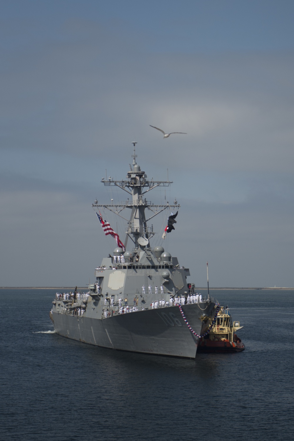 Description: A large ship in the water with a bird flying over it and a flag on the mast of the ship.