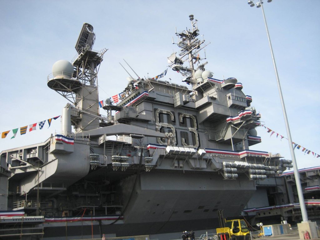 Description: A large ship with a lot of windows and flags on it's side and a crane on the side of the ship.