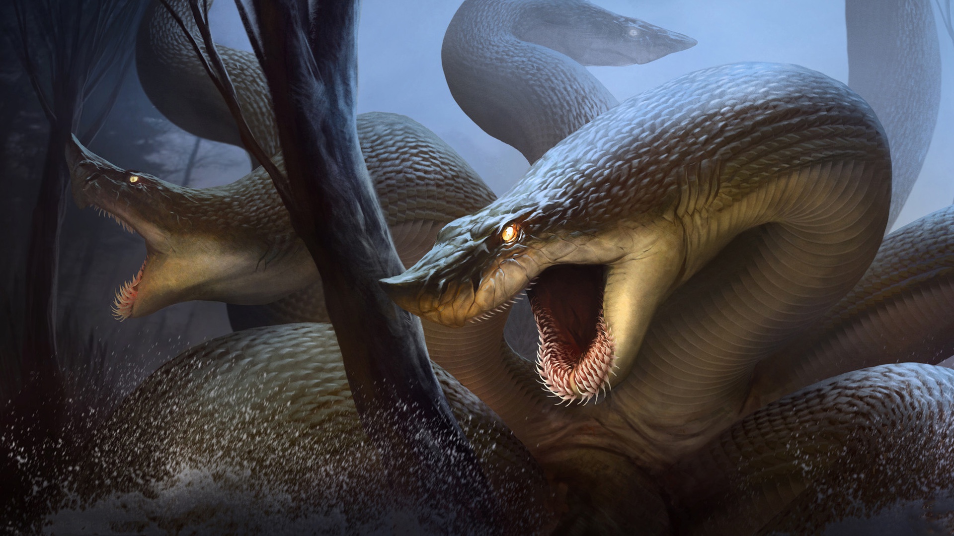Description: A large snake with its mouth open and its tongue out in the air.