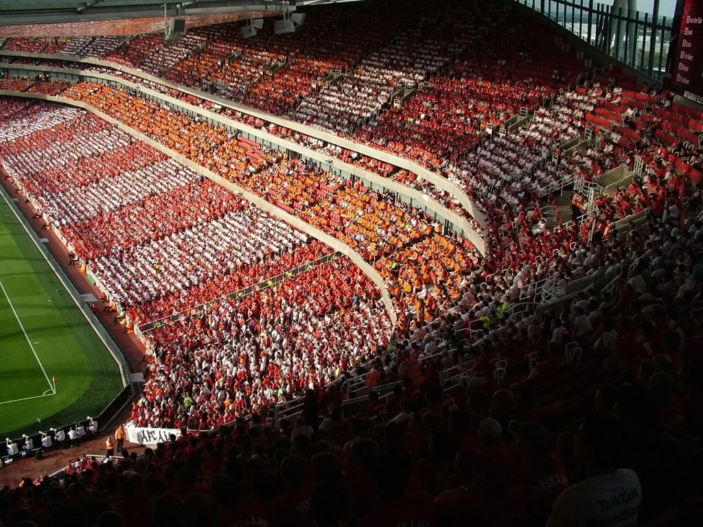 Description: A large stadium filled with lots of people sitting on the sidelines of it's seats and a soccer field.