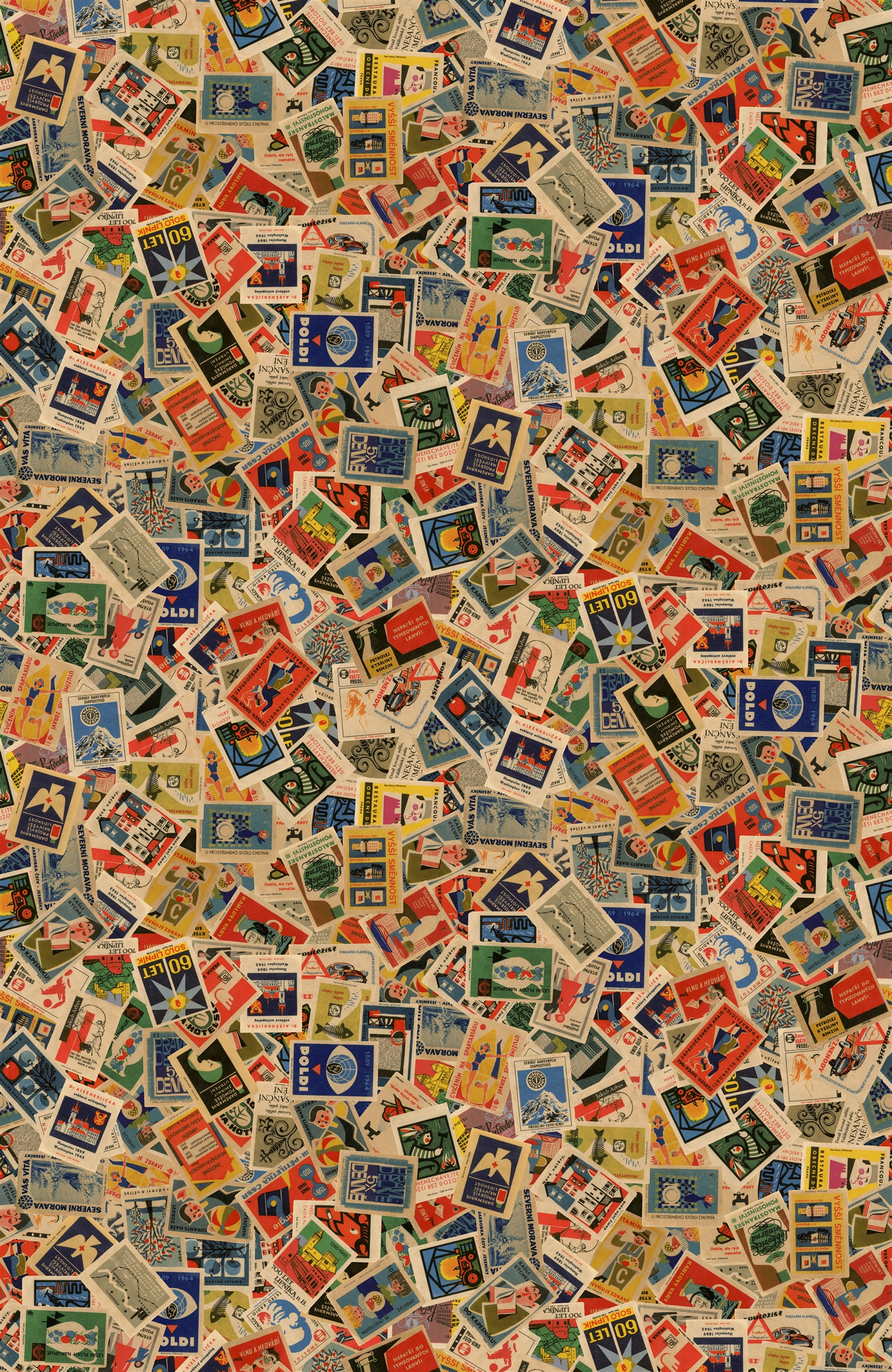 Description: A very large amount of stamps on a wallpaper background that is very colorful and colorful.