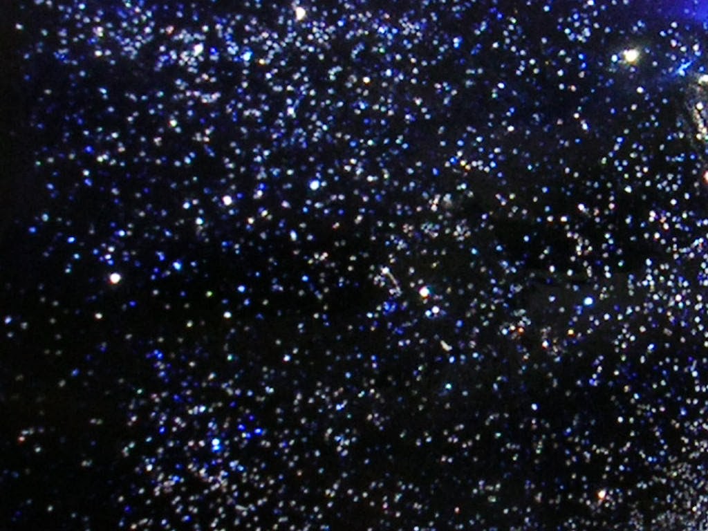 Description: A very large star cluster in the sky with a bright blue light shining on it's side and a black background.