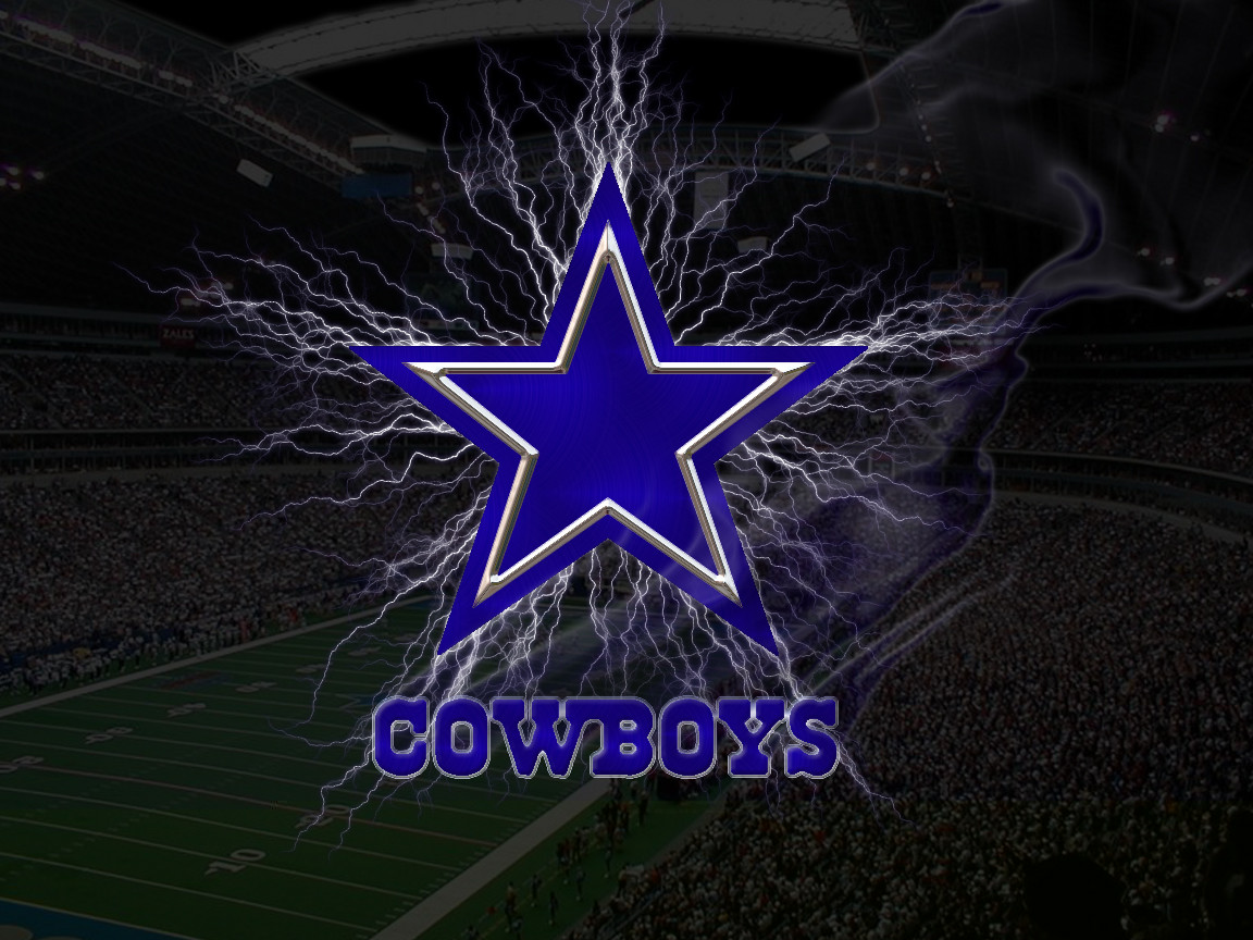 Description: A large star with lightning in the middle of it and a football field in the background with a stadium full of people.