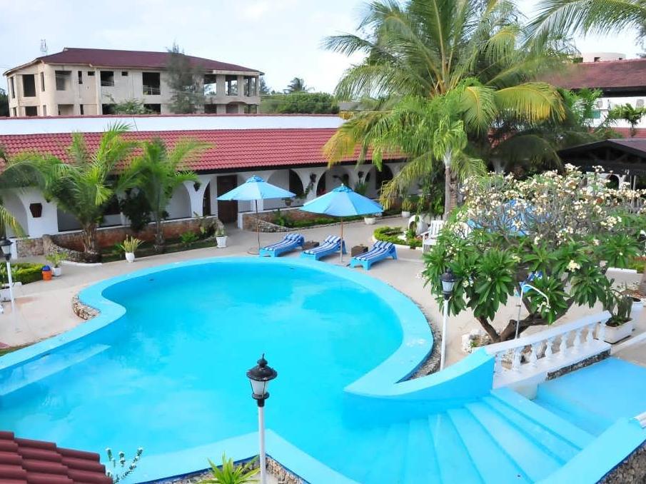 Description: A large swimming pool with a bunch of chairs and umbrellas around it and a building in the background.