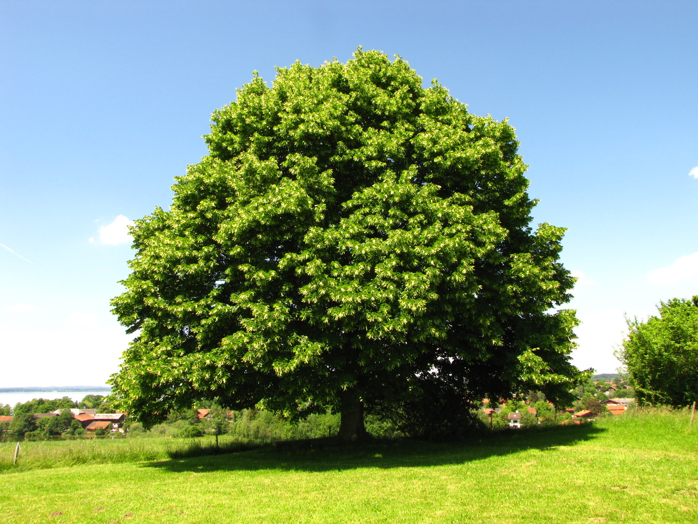 Description: A large tree in a grassy field with a blue sky in the background and a few clouds in the sky.