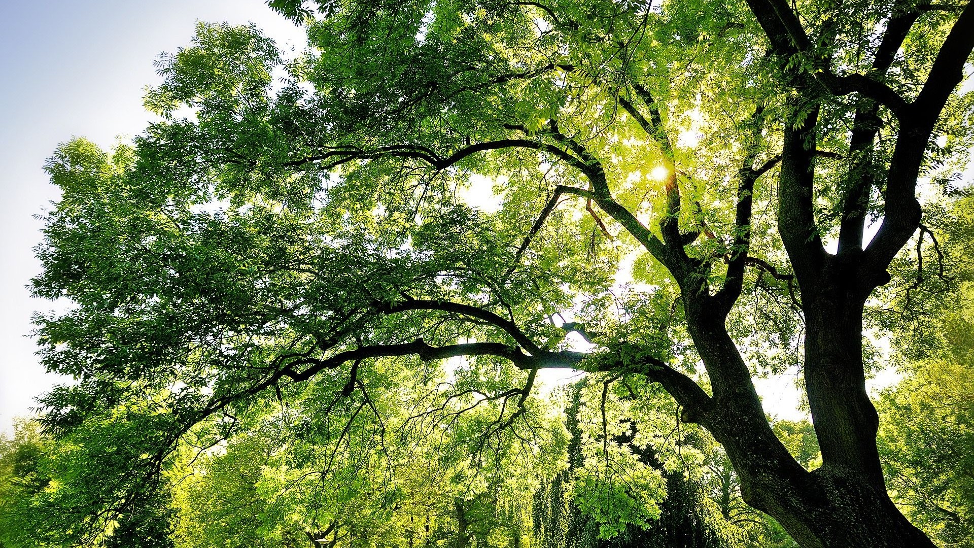 Description: A large tree with lots of green leaves in a park area with a bench and a bench in the foreground.