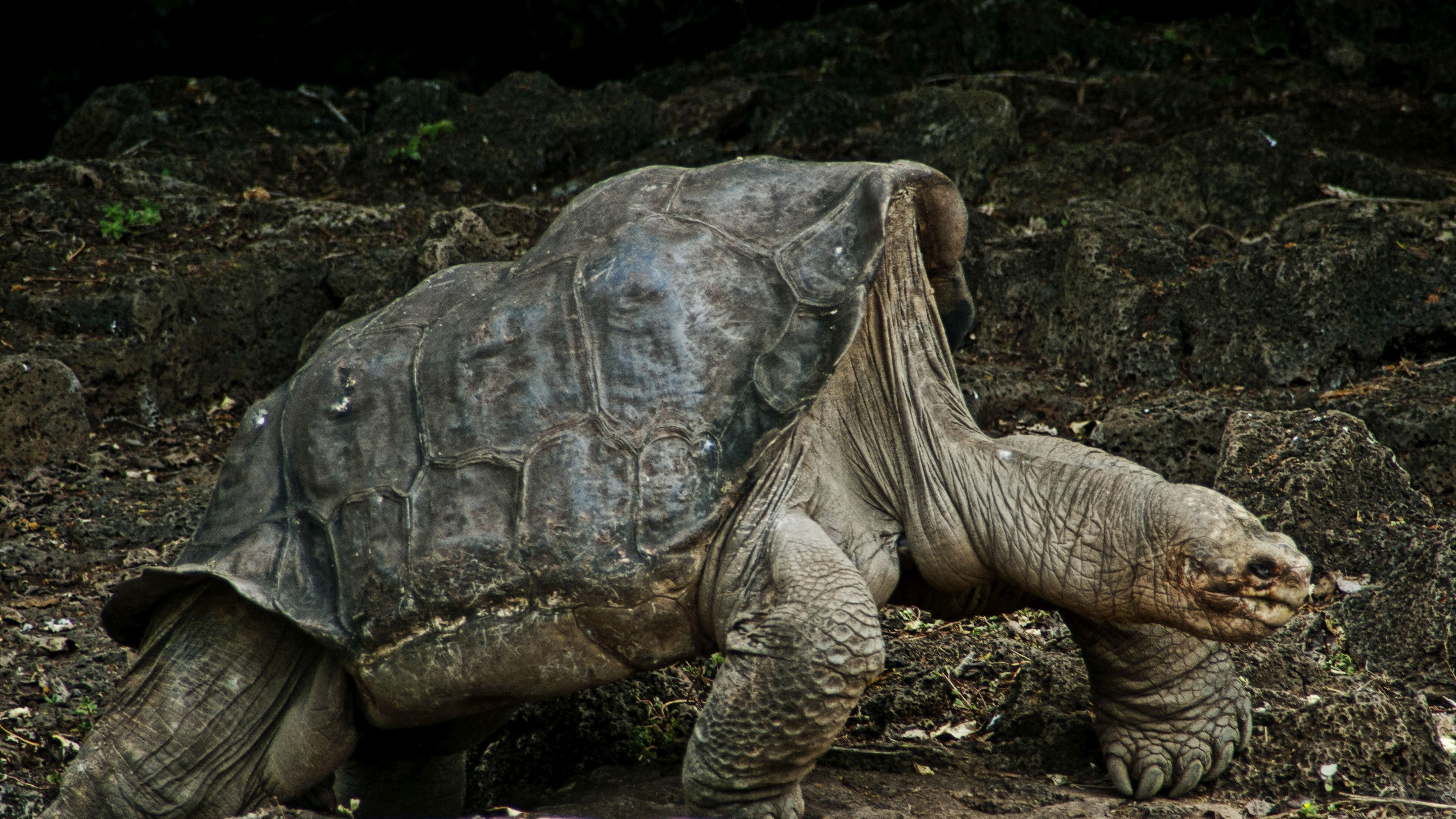 Description: A large turtle walking on top of a dirt field next to a forest filled with trees and bushes and rocks.