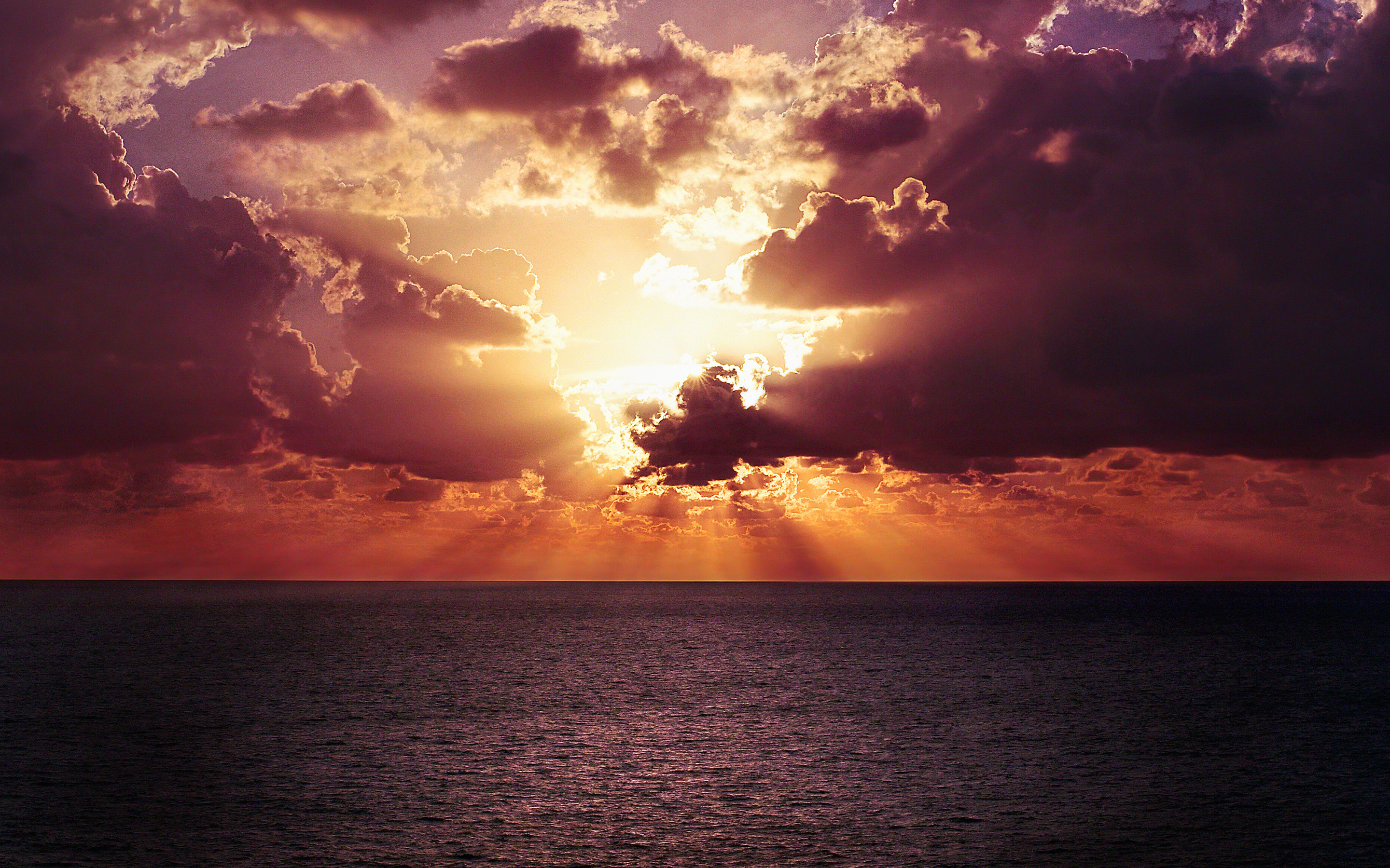 Description: A large body of water under a cloudy sky with sun rays coming through the clouds above it and a boat in the water below.