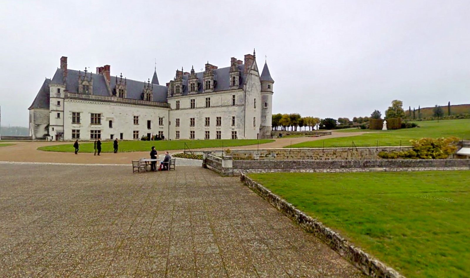 Description: A large white castle with a lot of windows and a lot of grass in front of it and people sitting on a bench.