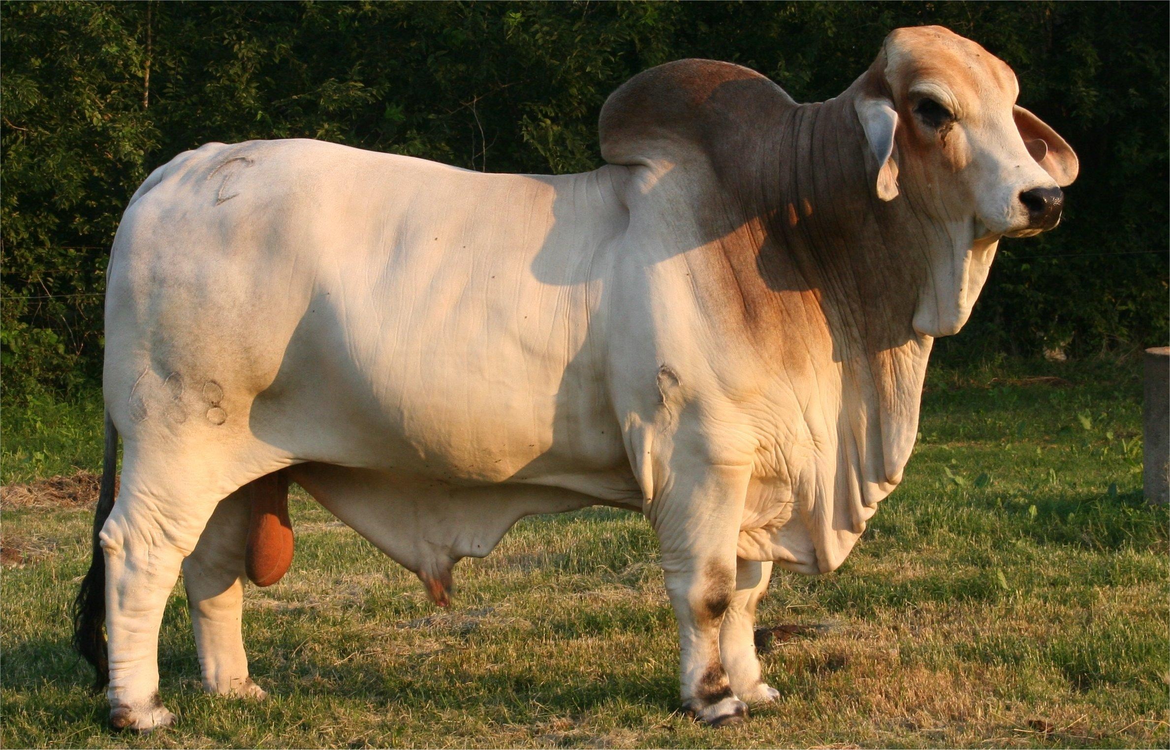 Description: A large white cow standing on top of a lush green field of grass next to a forest of trees.