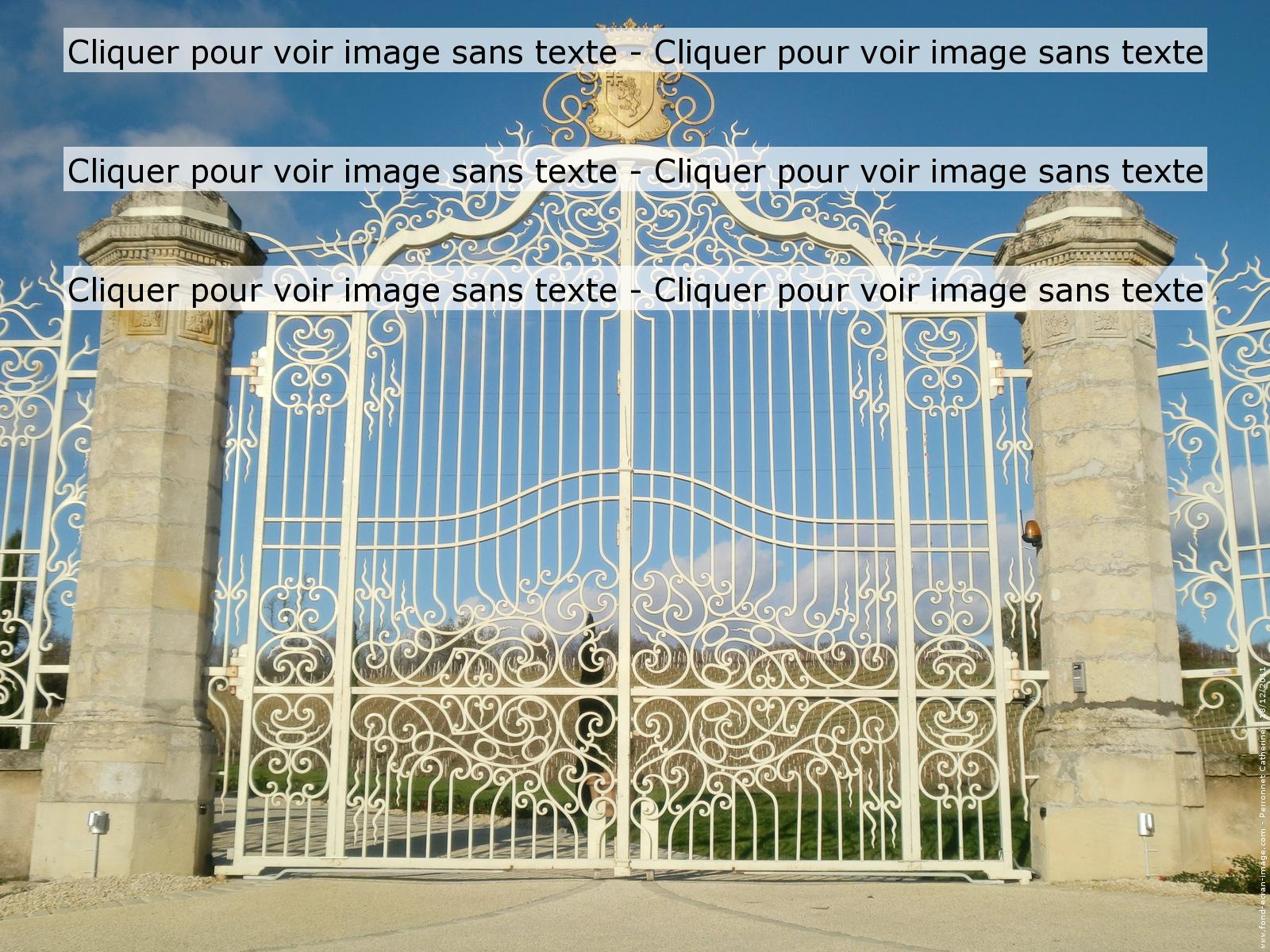 Description: A large white gate with a gold emblem on it's top and bottom part of it's sides.