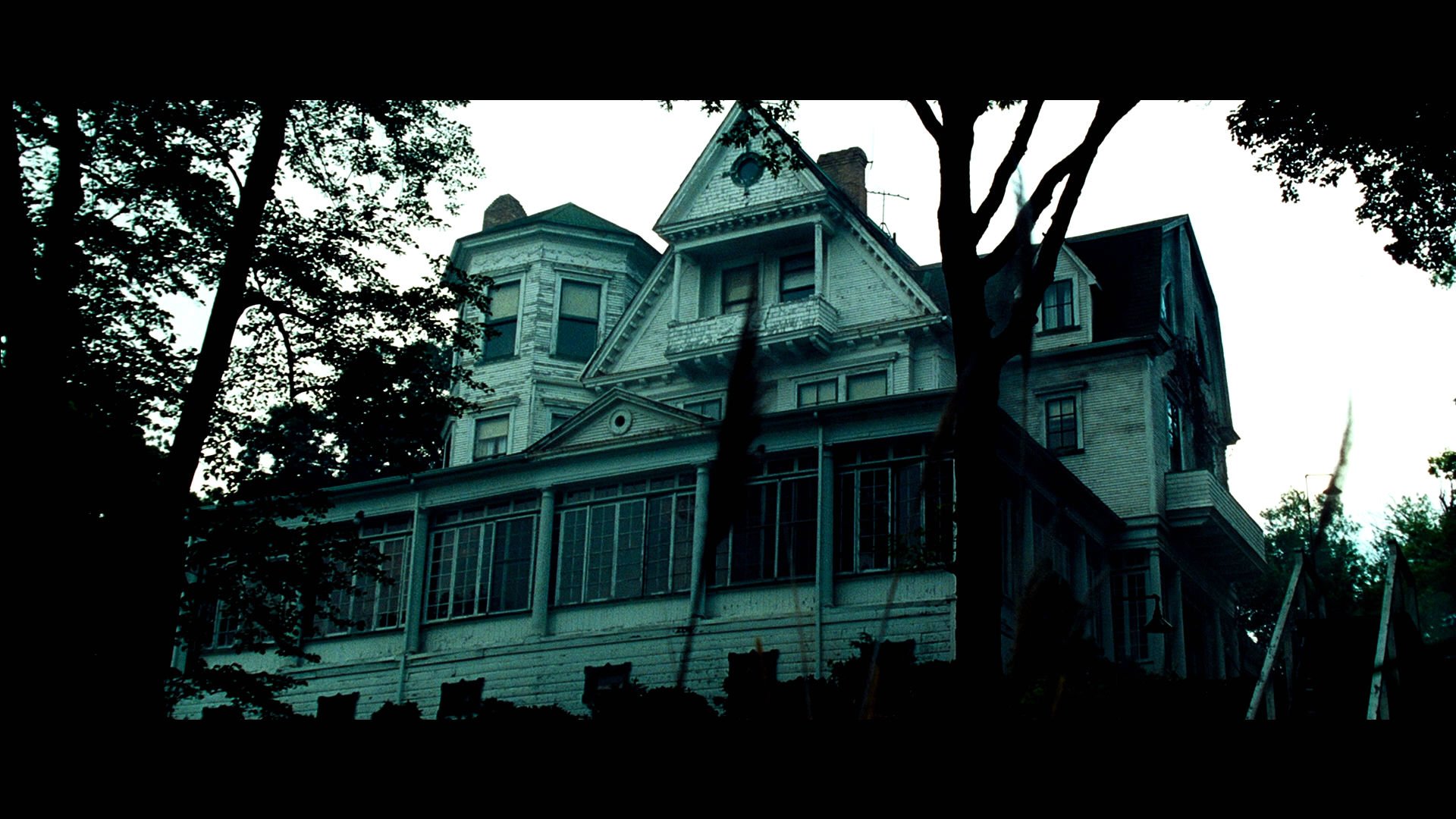 Description: A large white house with a tall tower and a clock on the front of it's face and a tree in front of it.