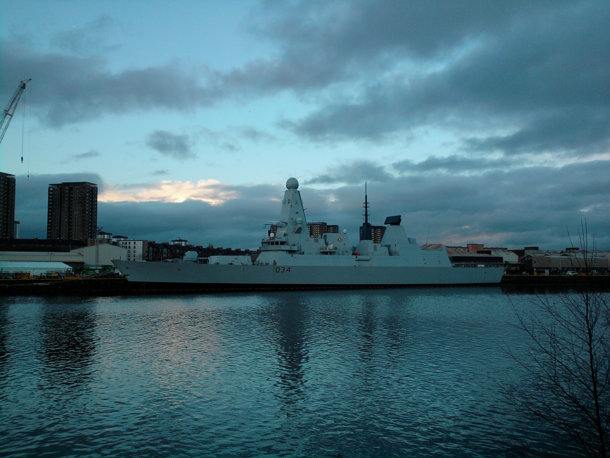 Description: A large white ship sitting in a harbor next to a city at dusk time with clouds in the sky.