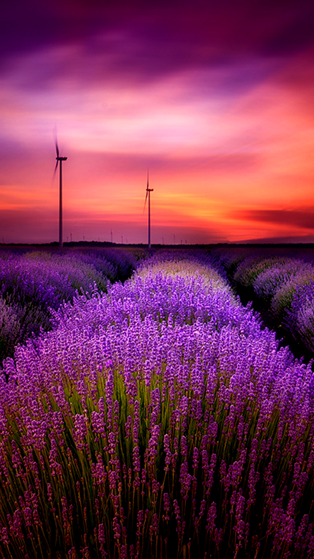Description: A field of lavender flowers with windmills in the background at sunset in the countryside of france.