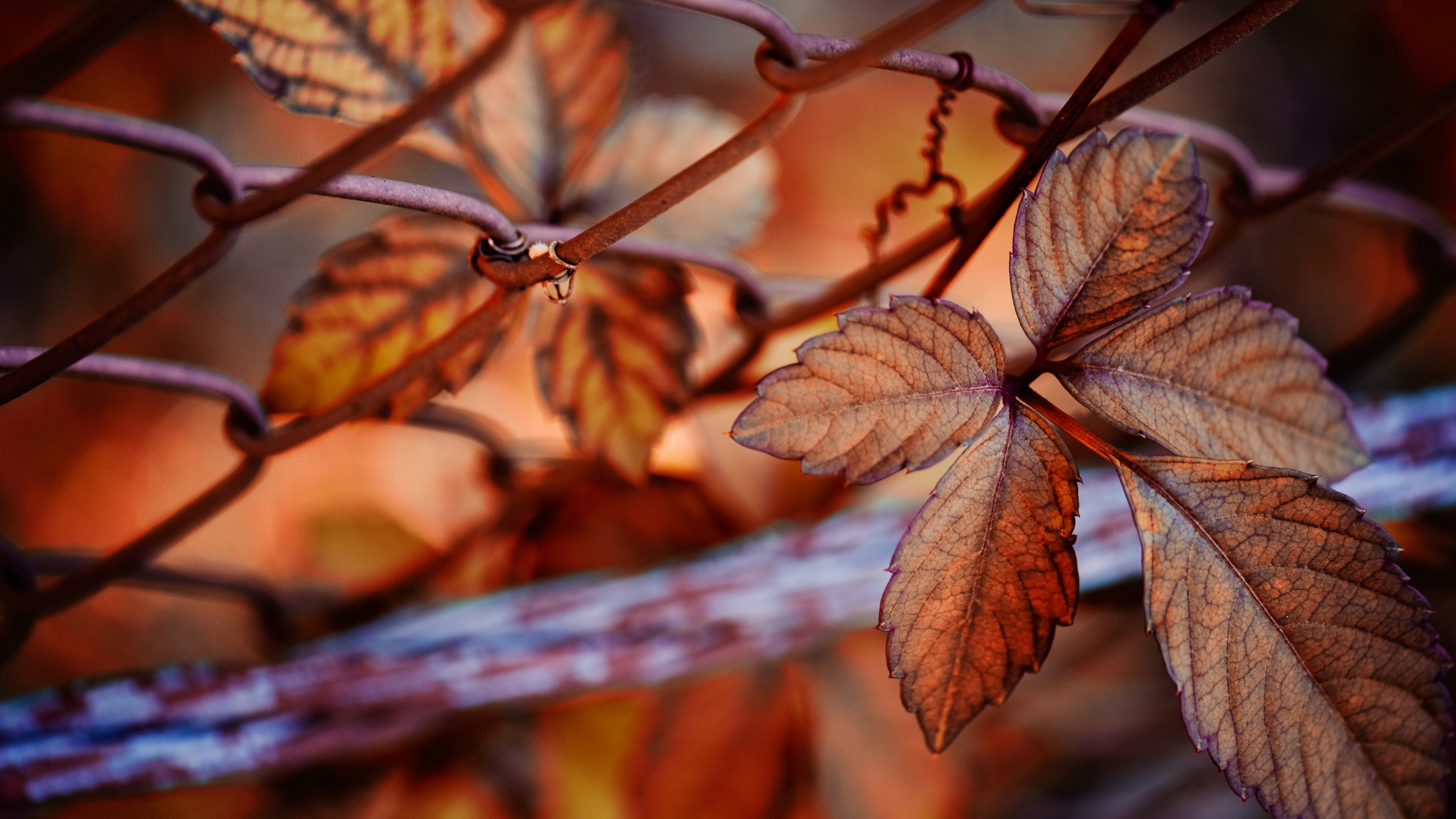 Description: A leaf is hanging on a fence with other leaves in the background and a blurry background behind it.