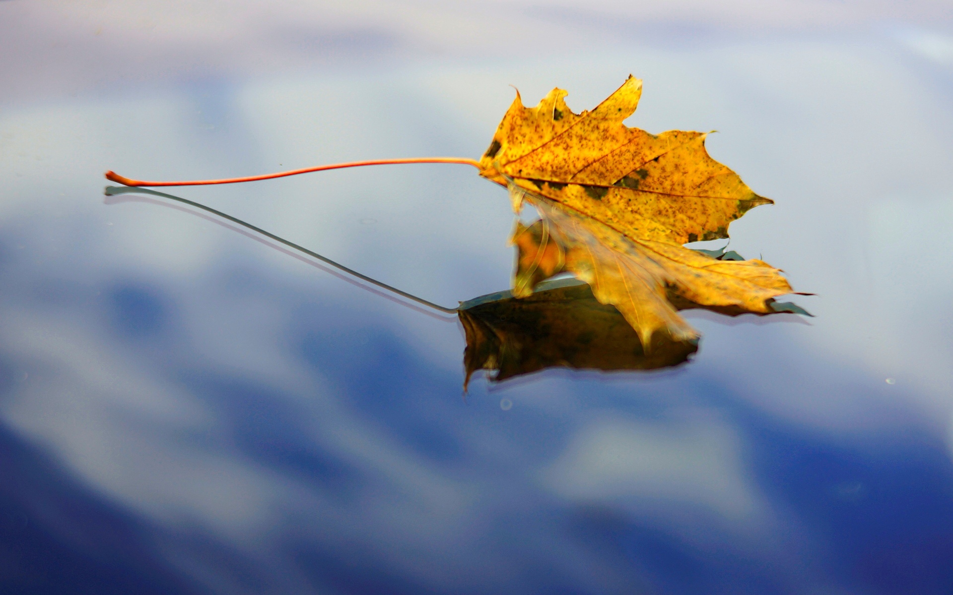 Description: A leaf floating on top of a body of water with a sky background behind it and a thin red line in the middle of the leaf.