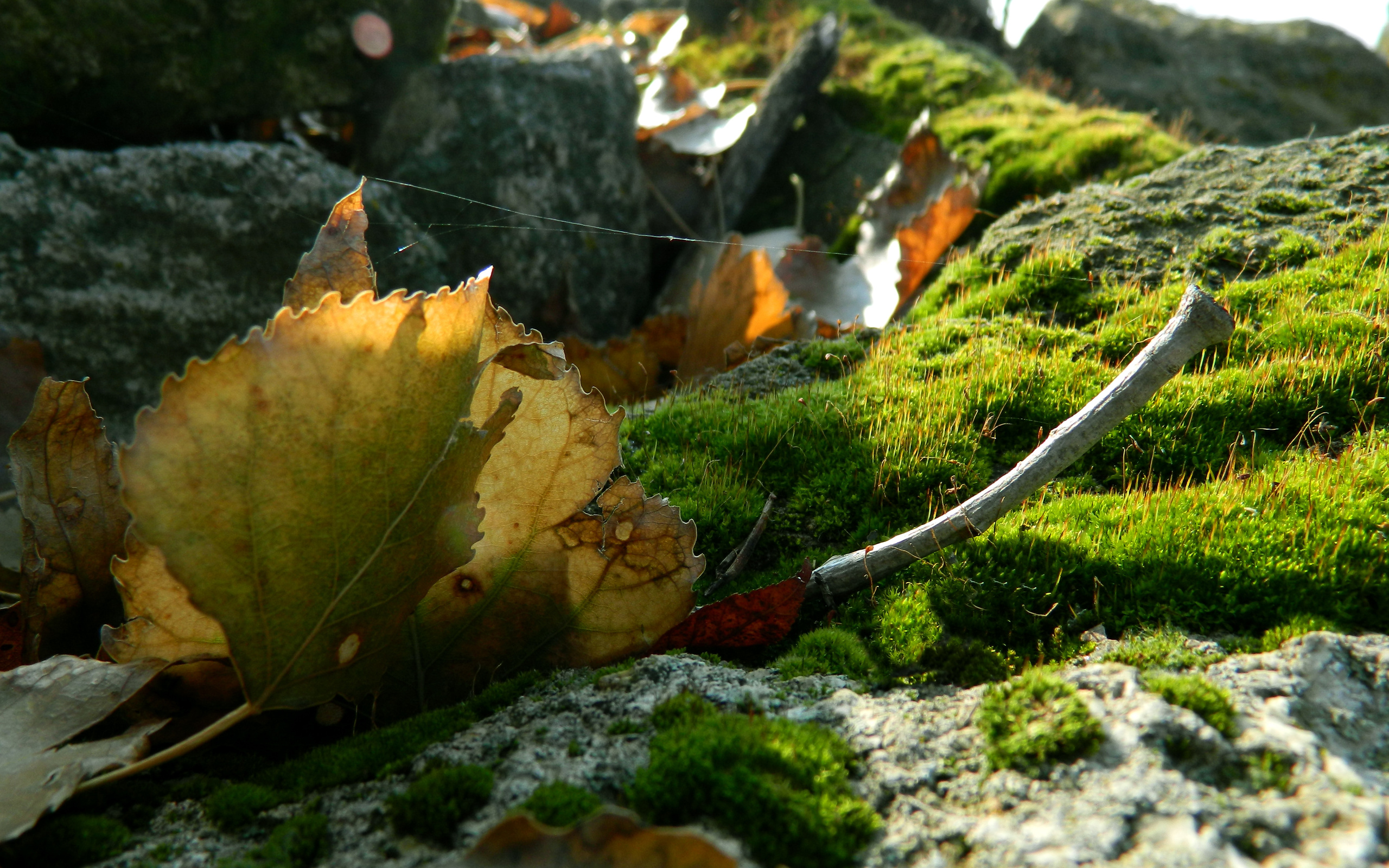 Description: A leaf is laying on a moss covered rock wall with a wire in the foreground and a rock wall in the background.
