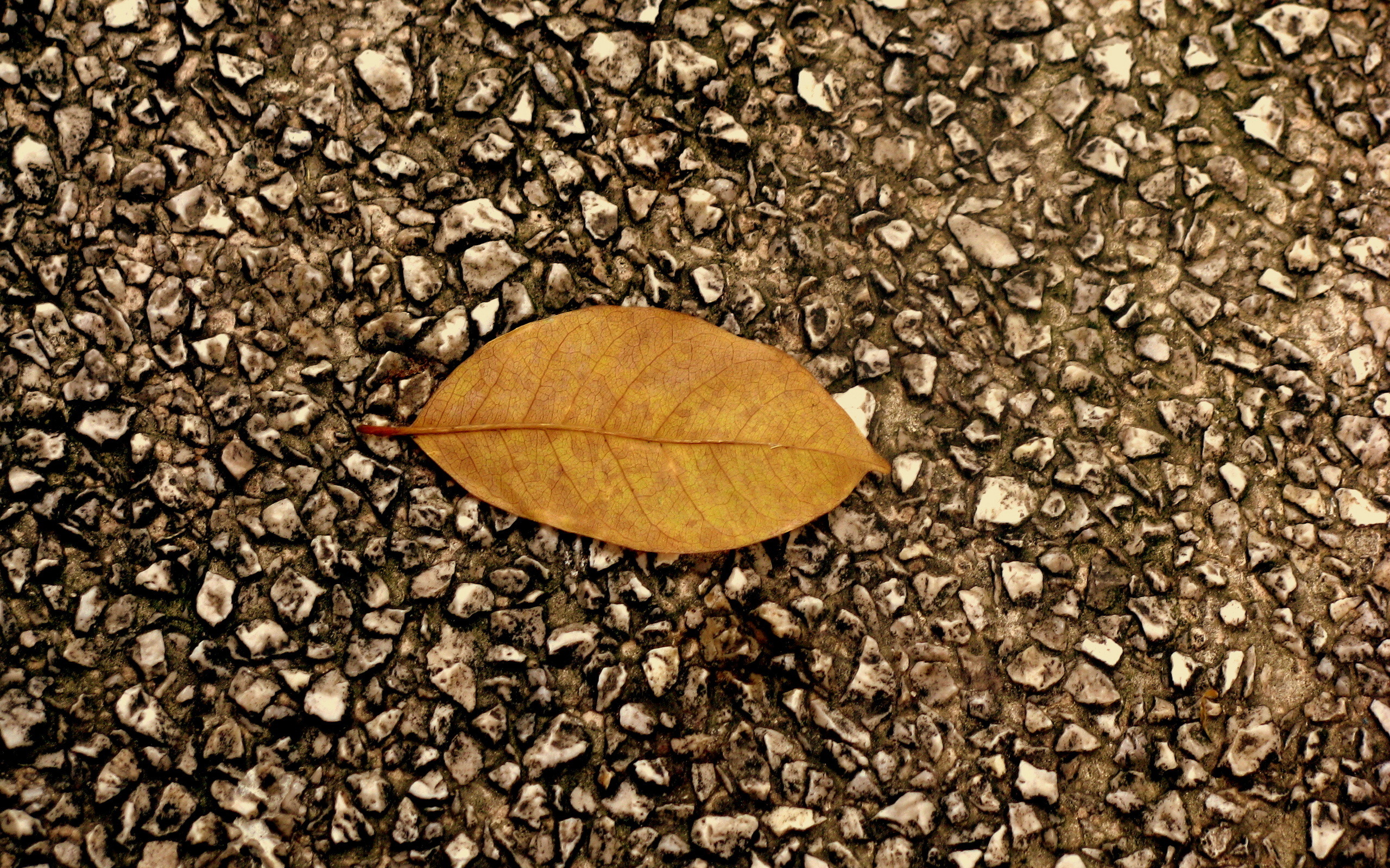 Description: A leaf laying on the ground with rocks around it and a brown background with a white border around it.