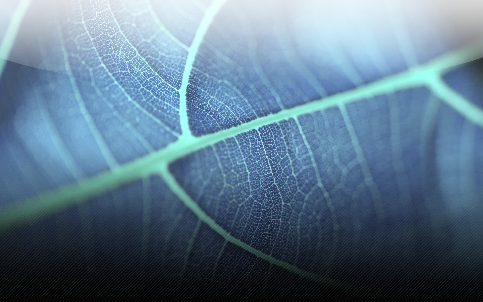 Description: A close up of a leaf's texture with a blurry background of blue and green colors and a light.