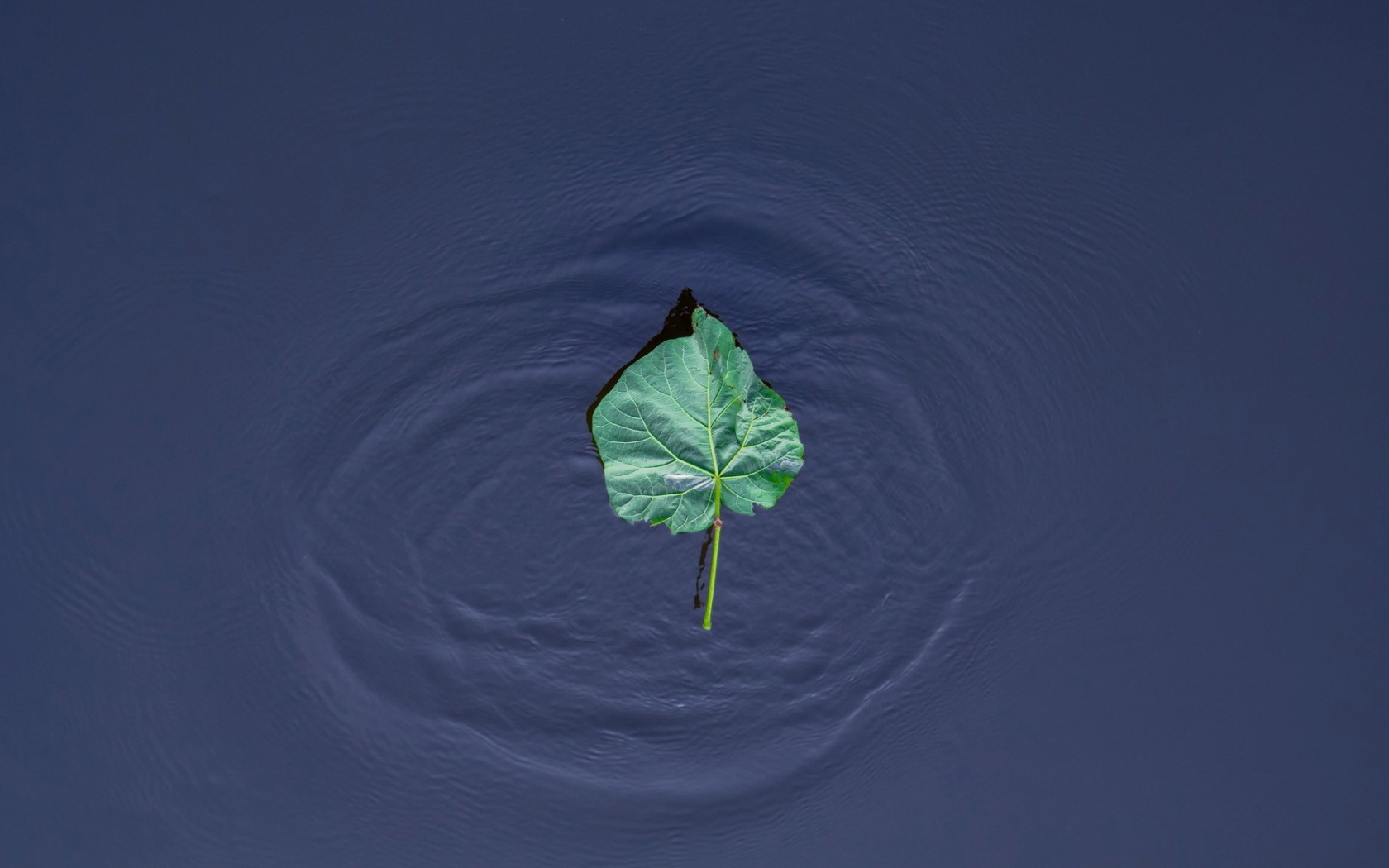 Description: A leaf floating on top of a body of water with a blue sky in the background and a circular design on the surface.