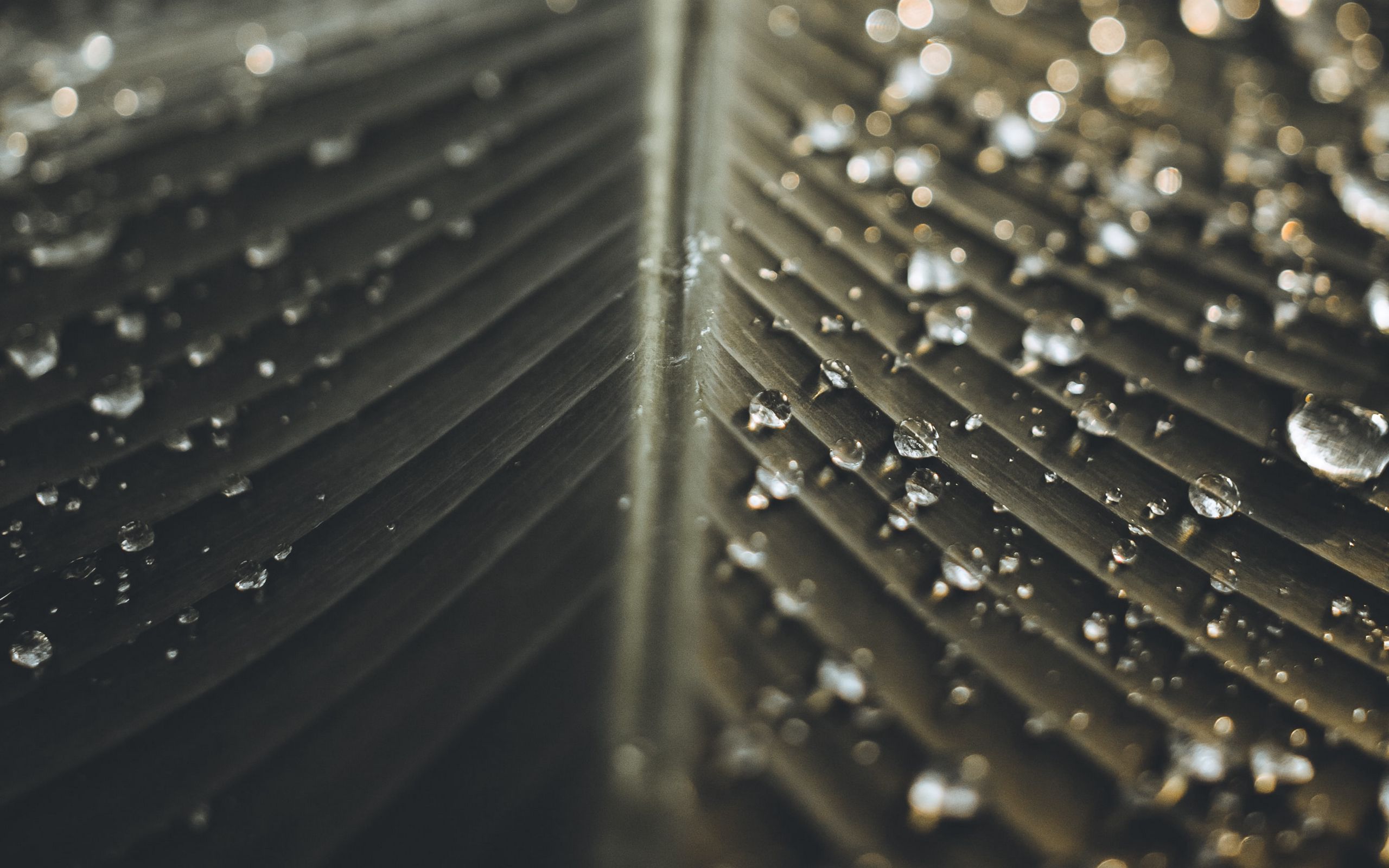 Description: A close up of a leaf with water droplets on it's surface and a black background with a white stripe.