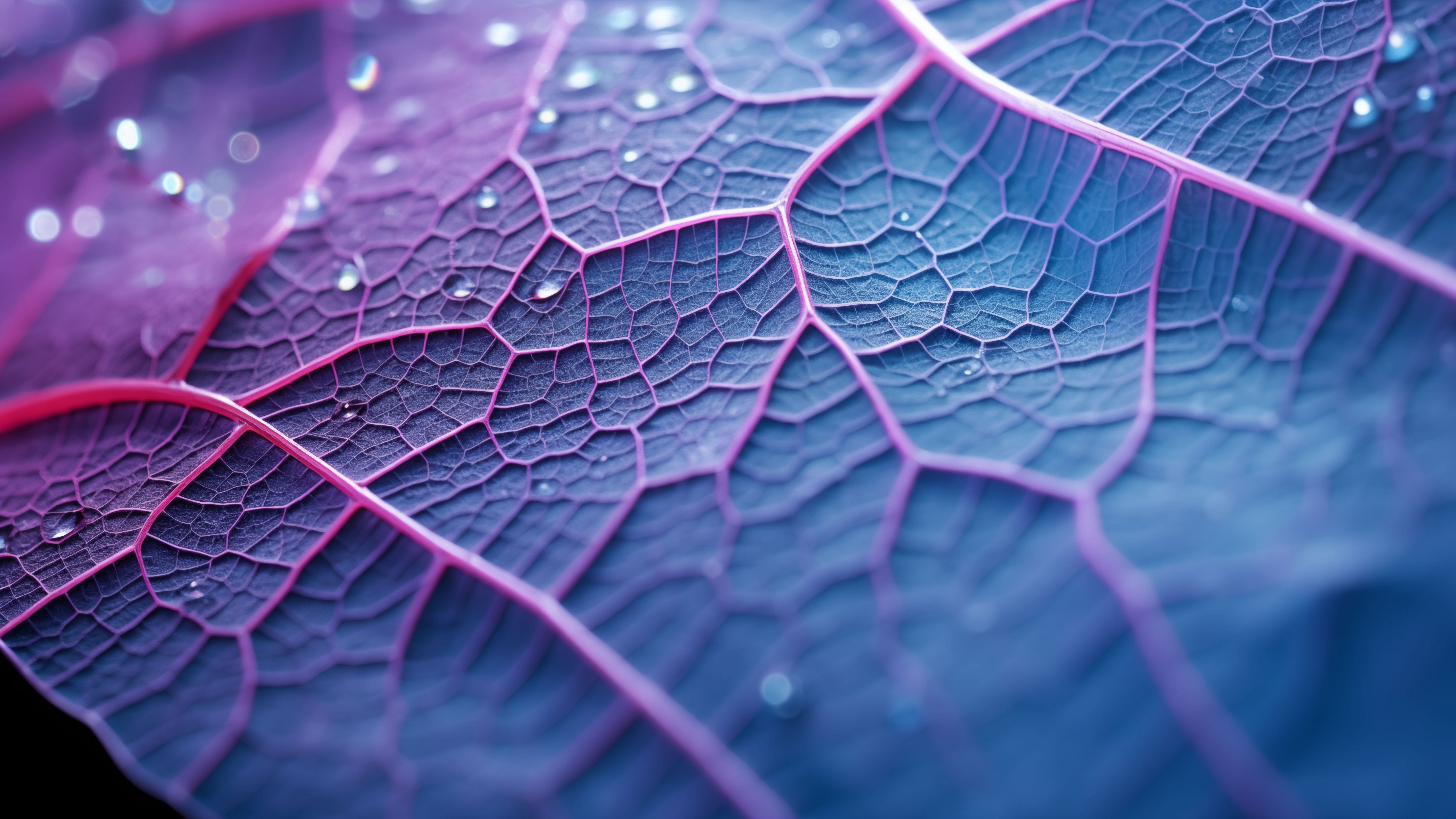 Description: A close up of a leaf with water droplets on it's leaves are purple and blue with a red center.