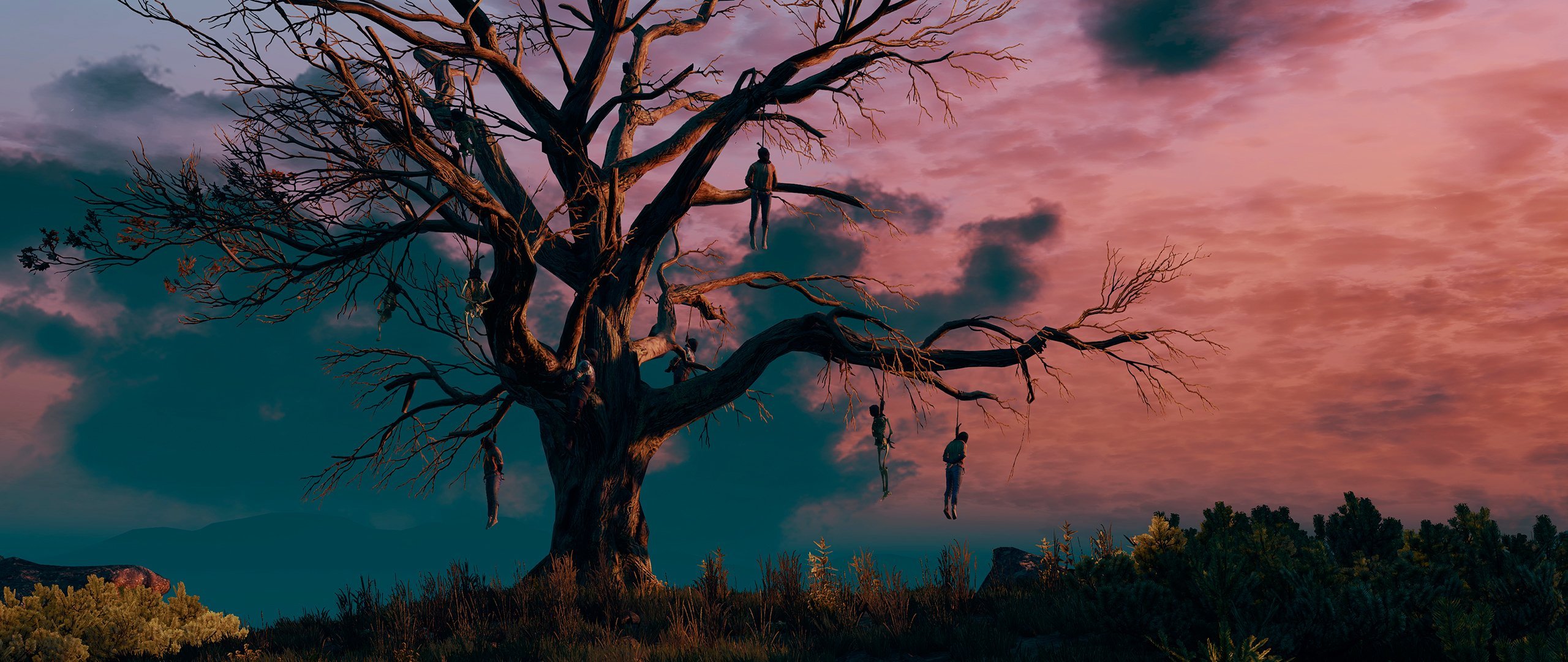Description: A tree with no leaves and a sky with clouds in the background with a pink and blue sky with clouds.