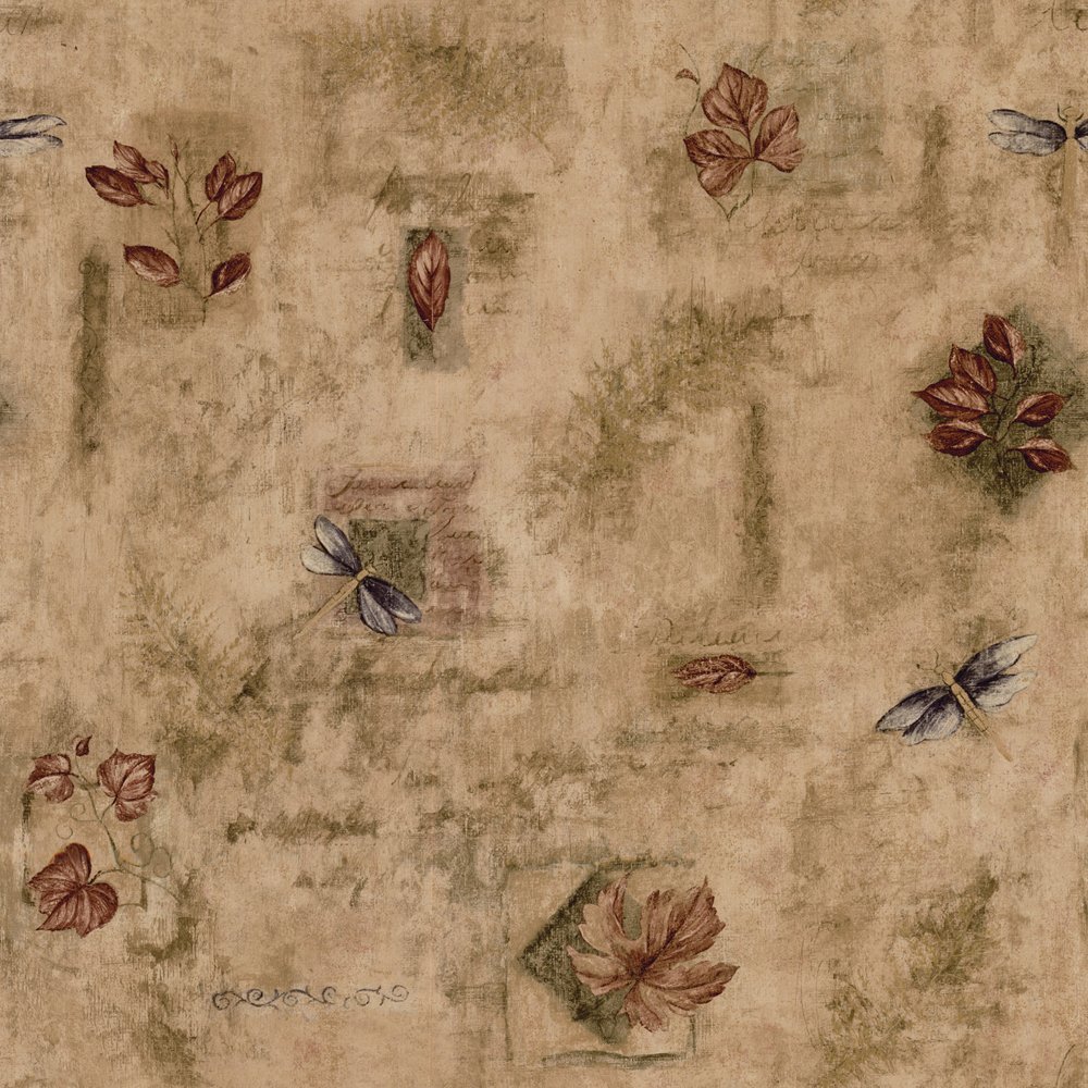 Description: A painting of leaves and a dragonfly on a wallpaper background with a faded background and a faded border.