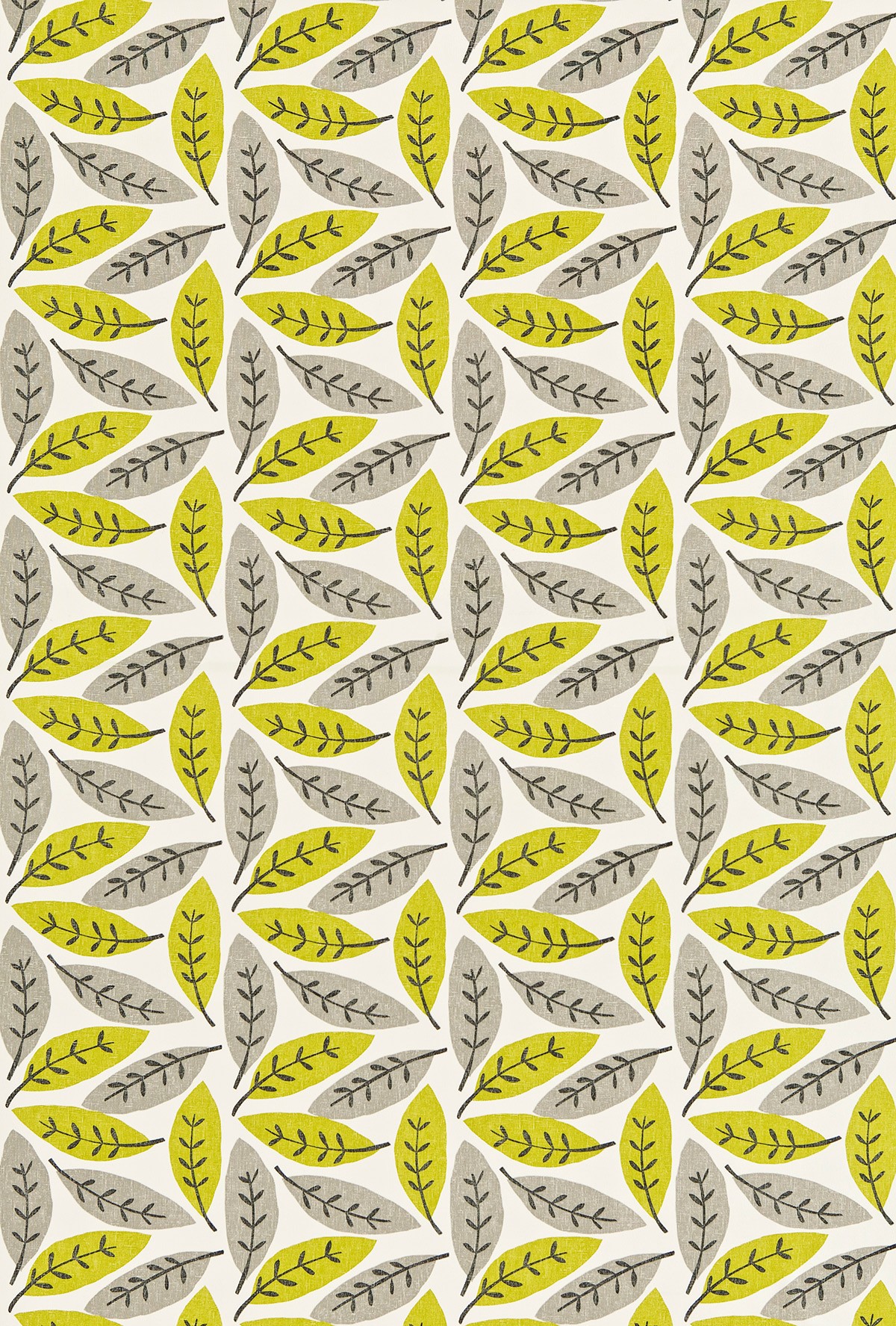 Description: A pattern of leaves on a white background with yellow and gray colors.