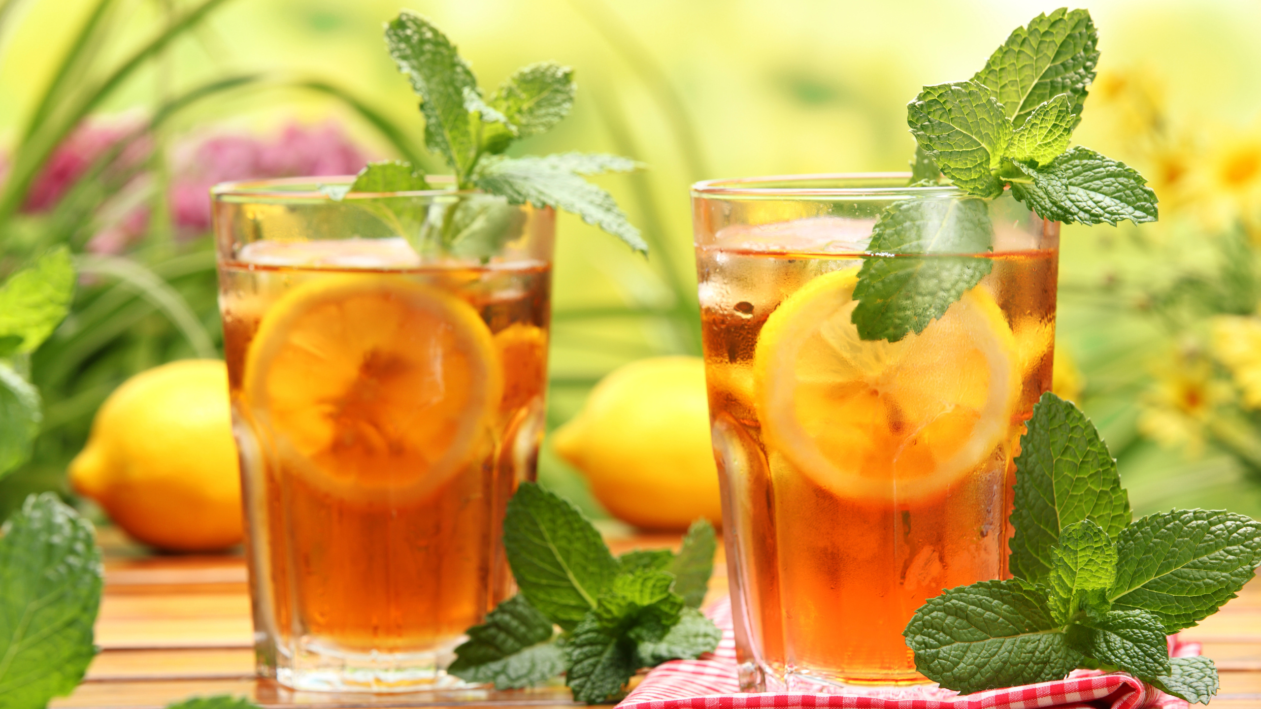 Description: Two glasses of lemon tea with mint and lemons in the background on a table with flowers and flowers.