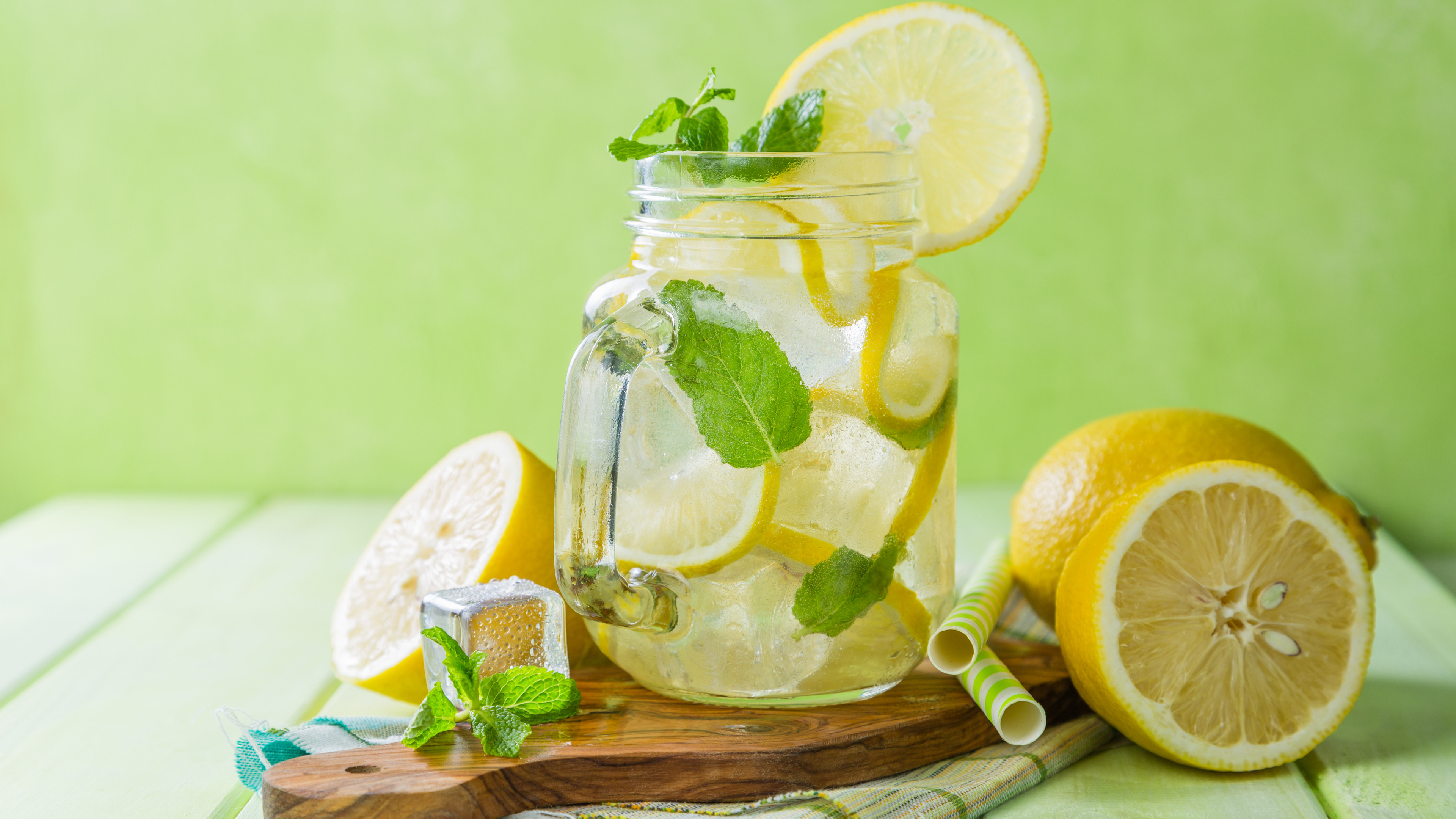 Description: A jar of lemonade with mint and lemon slices on a cutting board with a knife and a lemon.