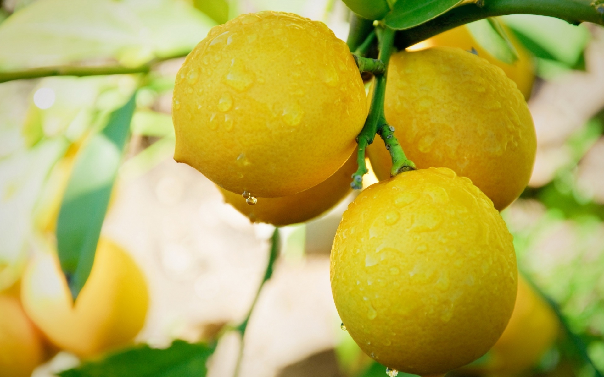 Description: A bunch of lemons hanging from a tree branch in the rain with drops of water on them and leaves.