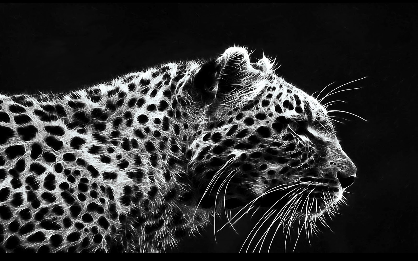 Description: A black and white photo of a leopard looking off into the distance with its mouth open and a black background.